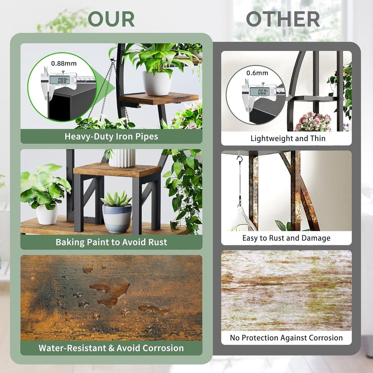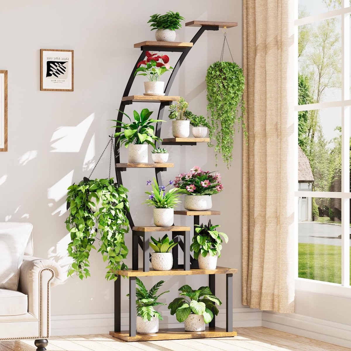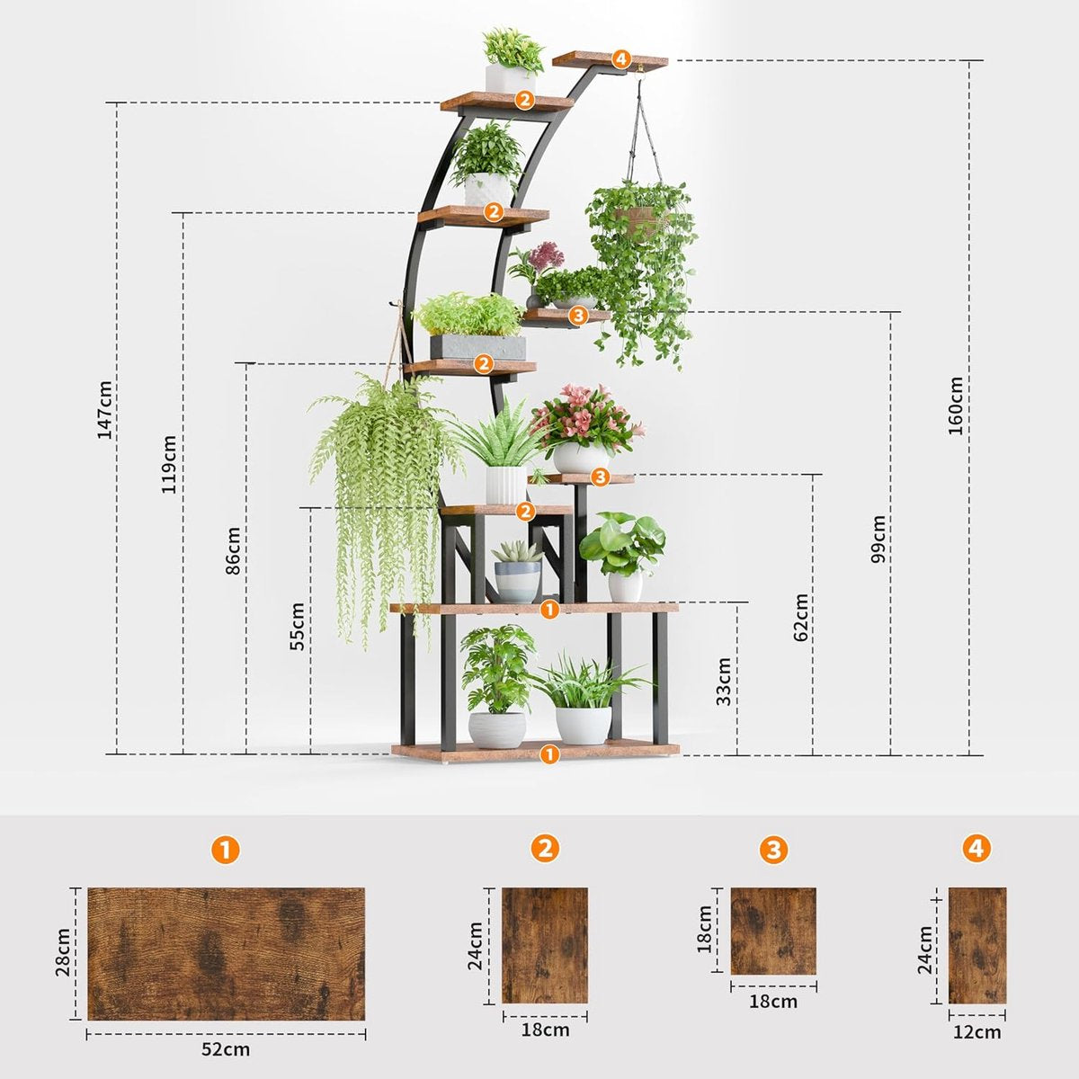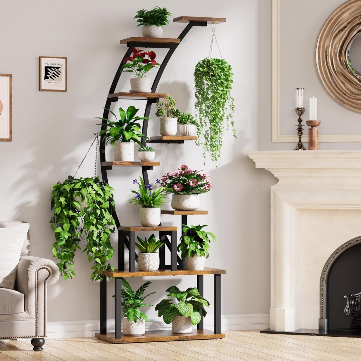 Ruimtebesparend ontwerp voor maximale capaciteit: deze metalen bloemenstandaard met 9 verdiepingen biedt plaats aan 9 of meer bloempotten tegelijk. De trapsgewijze opstelling zorgt voor een optimale lichtinval op je plantenbloemen. Robuust en duurzaam: onze plantenstandaard heeft een hoogwaardig metalen frame en een versterkte basis van verdikt hout, wat het draagvermogen en stabiliteit verhoogt. Het is bestand tegen breuk en vervorming. Elegante decoratie en ruimtebesparende oplossing: onze vintage plantentrap met minimalistische stijl combineert een houtnerfplank met een metalen frame dat perfect past bij je woonkamer, hoek, balkon, hal, tuin of terrasdecoratie.
