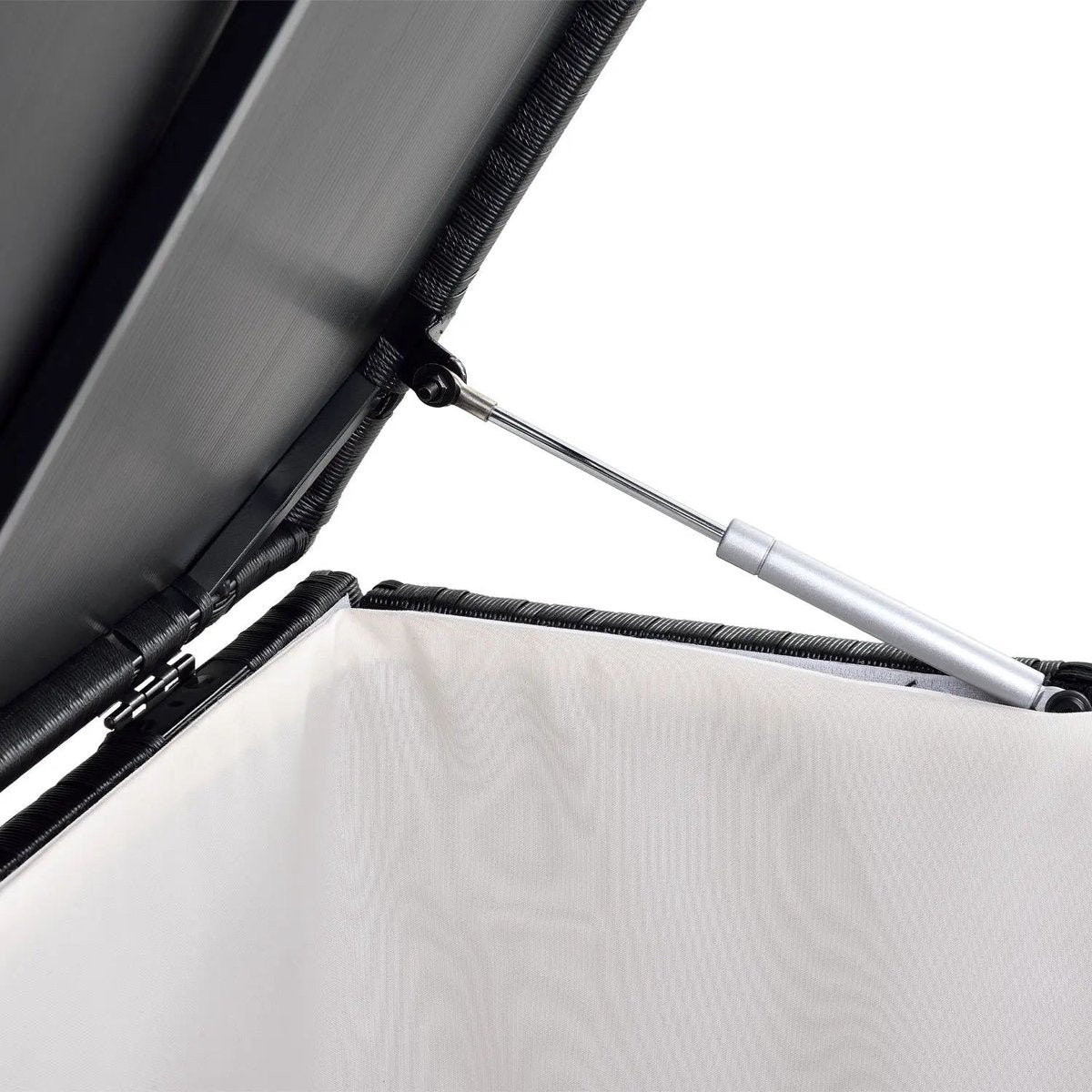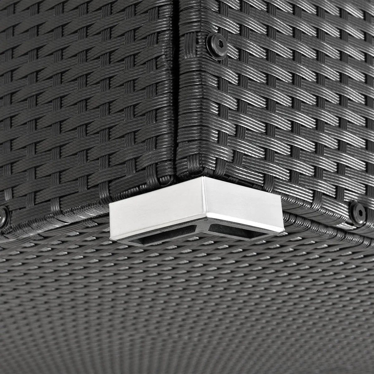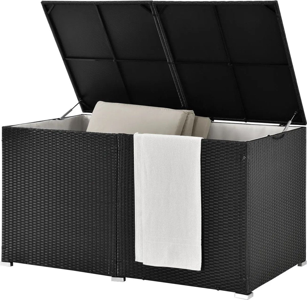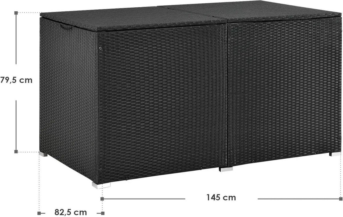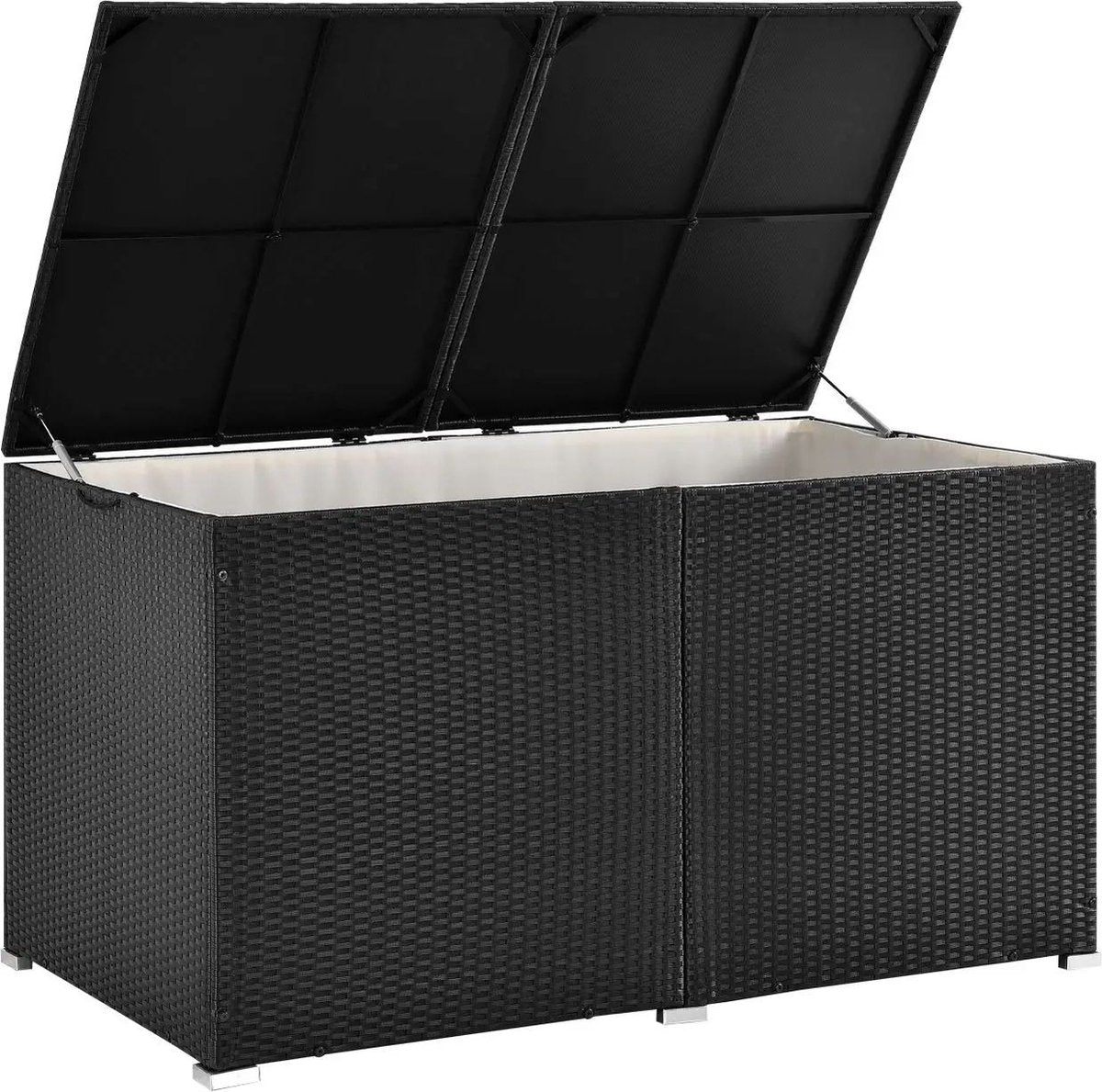 De polyrattan tuinmeubelbox Ikaria (950 L volume, zwart) biedt de perfecte opbergruimte voor je tuinspullen. Berg kussens, kussens of kinderspeelgoed netjes op in de tuinbox. Het binnenzeil zorgt voor extra bescherming en het deksel houdt de doos gesloten. Een automatische hefinrichting op het deksel zorgt voor een veilige sluiting. De opbergdoos is een echte eyecatcher. Of het nu buiten op het terras, het balkon, in de tuin of binnen in de serre is. De polyrattan kist maakt indruk met zijn moderne en stabiele stijl.