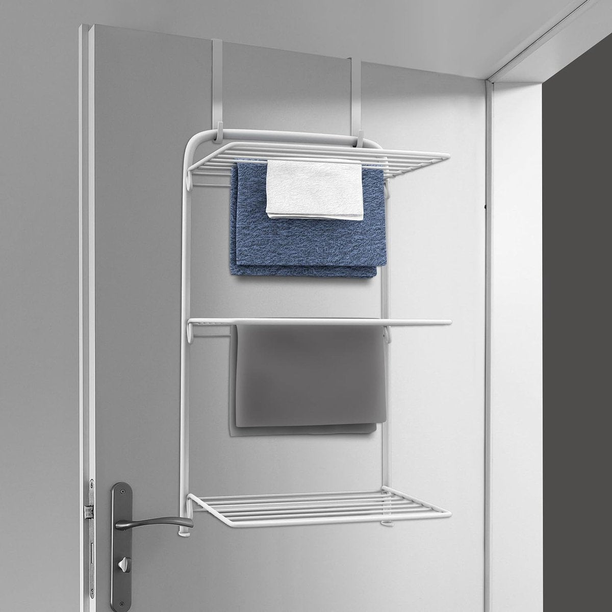 Slim design: ons praktische droogrek Viggo voor deur is de ideale oplossing voor een eenvoudige en ruimtebesparende wasdroging. De hoogwaardige materialen garanderen een hoge duurzaamheid Veelzijdig inzetbaar: het droogrek is op vele manieren te gebruiken, of het nu aan de deur of de douchecabine is. Hij biedt niet alleen voor thuis een geweldige manier om te drogen, maar kan ook voor buiten of op vakantie worden gebruikt Ruimtebesparend drogen: het droogrek is perfect geschikt voor huishoudens met beperkte ruimte of zonder wasruimtes. Bij niet-gebruik kunnen de vleugels van de wasdroger snel en eenvoudig worden opgevouwen Eenvoudige montage: het deurdroogrek kan heel snel en probleemloos worden opgebouwd. Gewoon de houder over het deurblad hangen en de standaard vasthaken. Daarna de vleugels uitklappen. Stabiel materiaal: de hangdroger bestaat uit robuust staal met een witte recyclebare kunststof afdekking. Hij heeft 3 uitklapbare vleugels met een diepte van 34 cm en biedt een 11 meter lange waslijn voor het drogen van alle soorten textiel