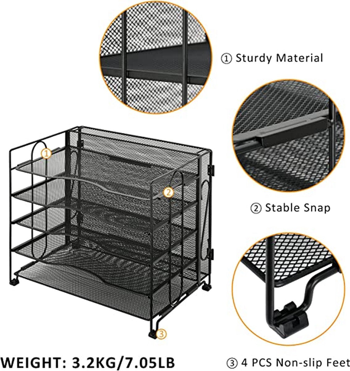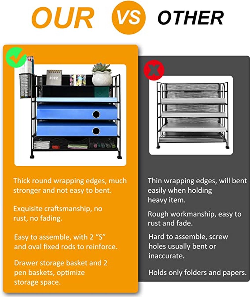 • 【Sturdy Durable】Paper organizer is made of lightweight, durable steel mesh and reinforced and reinforced with a solid steel frame, very sturdy and does not fade or rust. Non-slip rubber feet to prevent them from slipping or scratching surfaces. more stable and durable compared to many other similar products in the market.