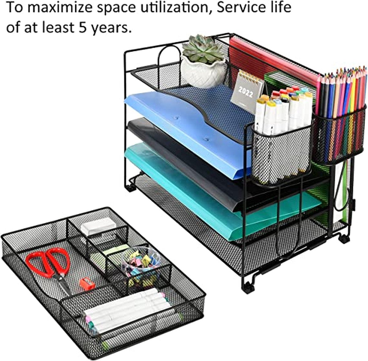 • 【New Upgraded Design】By customer feedback for in-depth research, upgraded and updated the desk organizer. Unique 5 Tier paper shelves design and a vertical file storage layer on the back, with 1 additional drawer and 2 additional pen holders (can be hung or used separately), completely an all-in-one desk organizer.