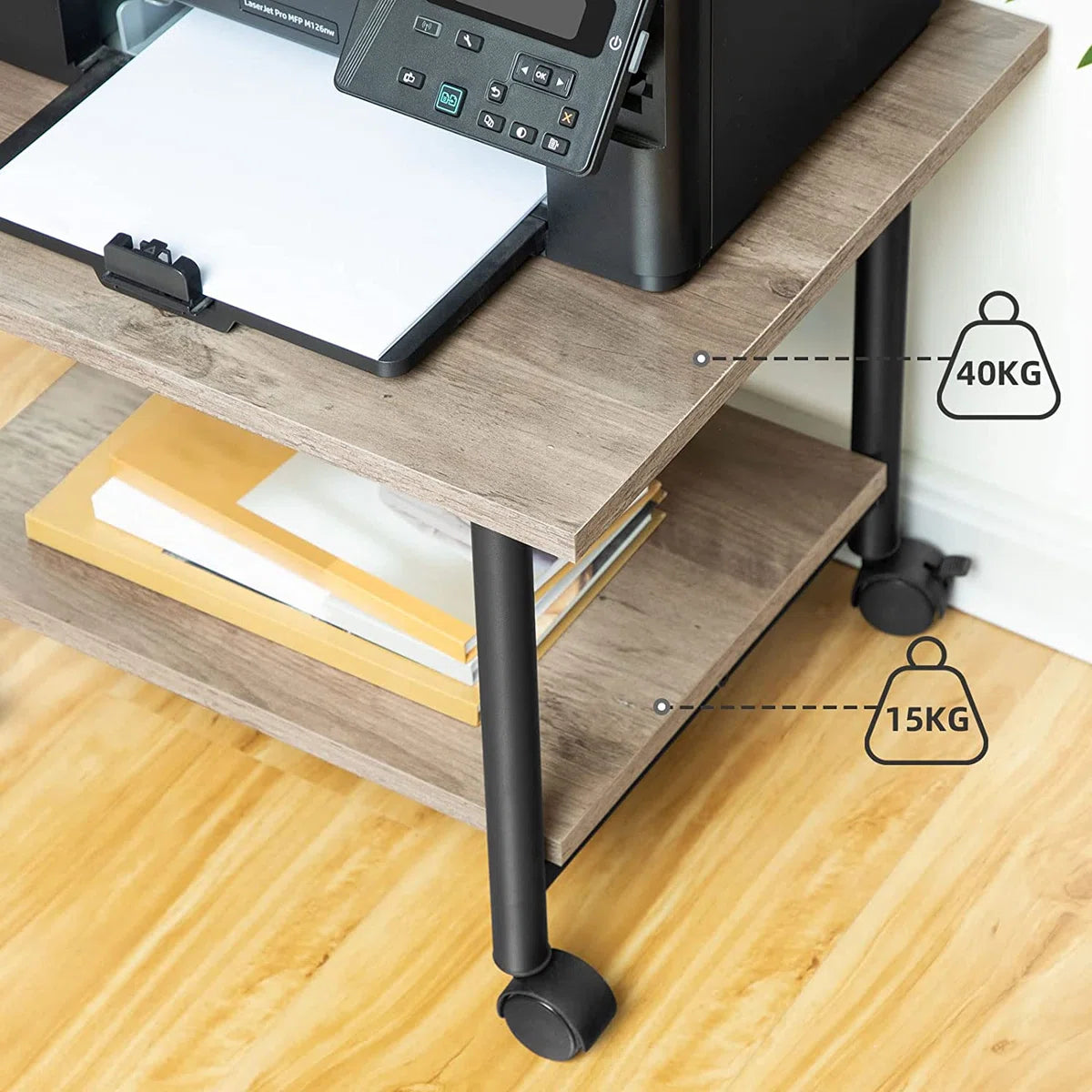 spaanplaat van kwaliteitsklasse E1 met een stevig ijzeren frame maken deze printertafel zeer duurzaam, en de versterkte zwarte metalen poten en balk onder de spaanplaat geven hem absolute stabiliteit