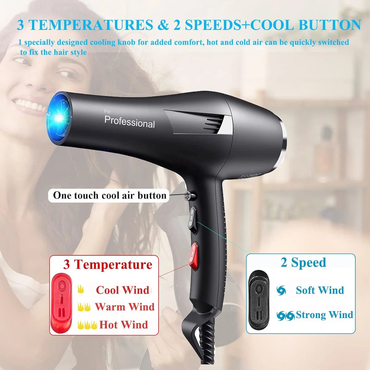 - Kies uit 3 warmtestanden en 2 ventilatorstanden, inclusief een verfrissende koelfunctie. Met 2400W vermogen en superieure windkracht droogt onze föhn snel zonder schade aan te richten.
