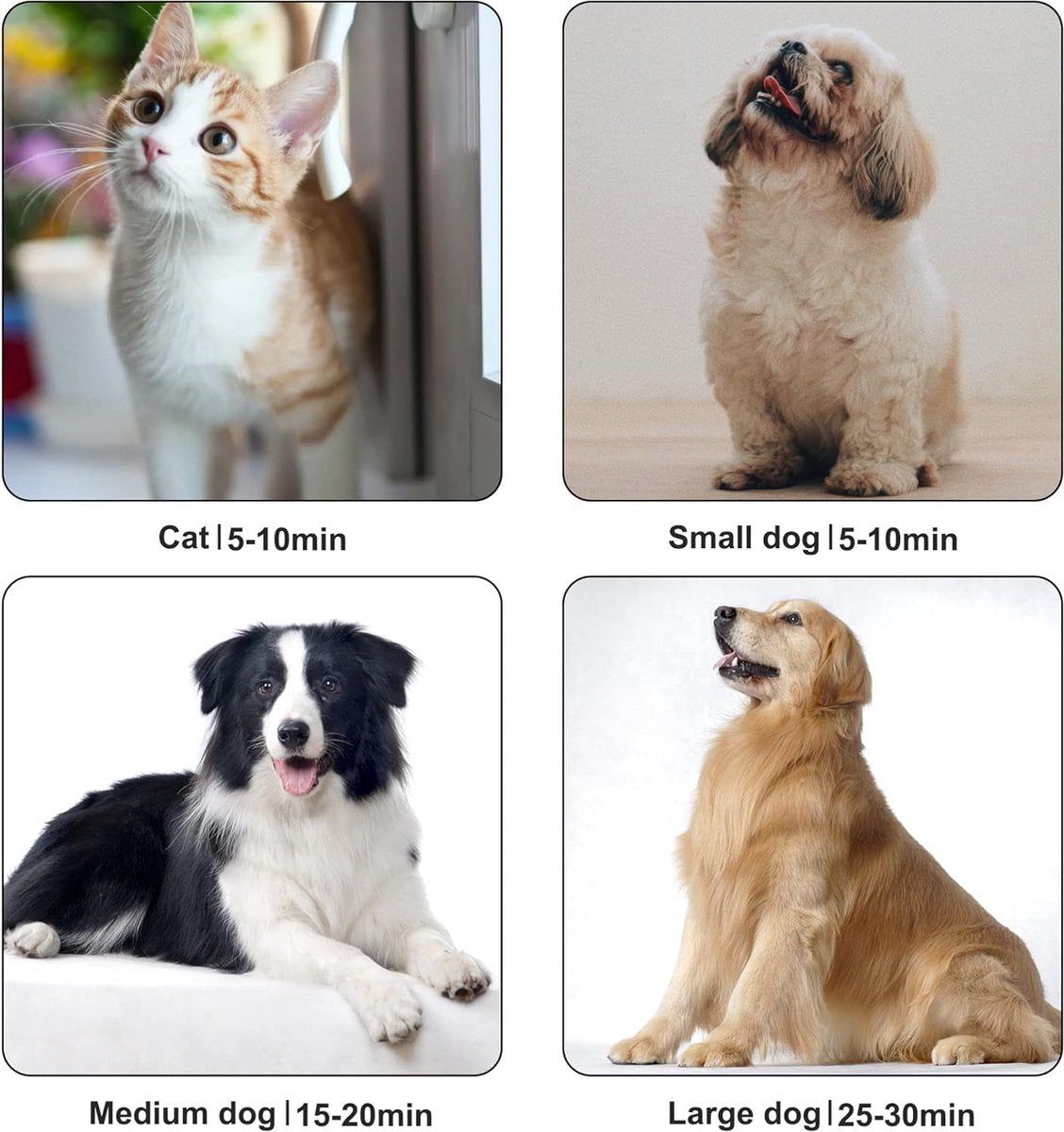 De föhn droogt kleine honden in ±2-3 minuten, middelgrote honden in ±10 minuten en grote honden in ±20 minuten