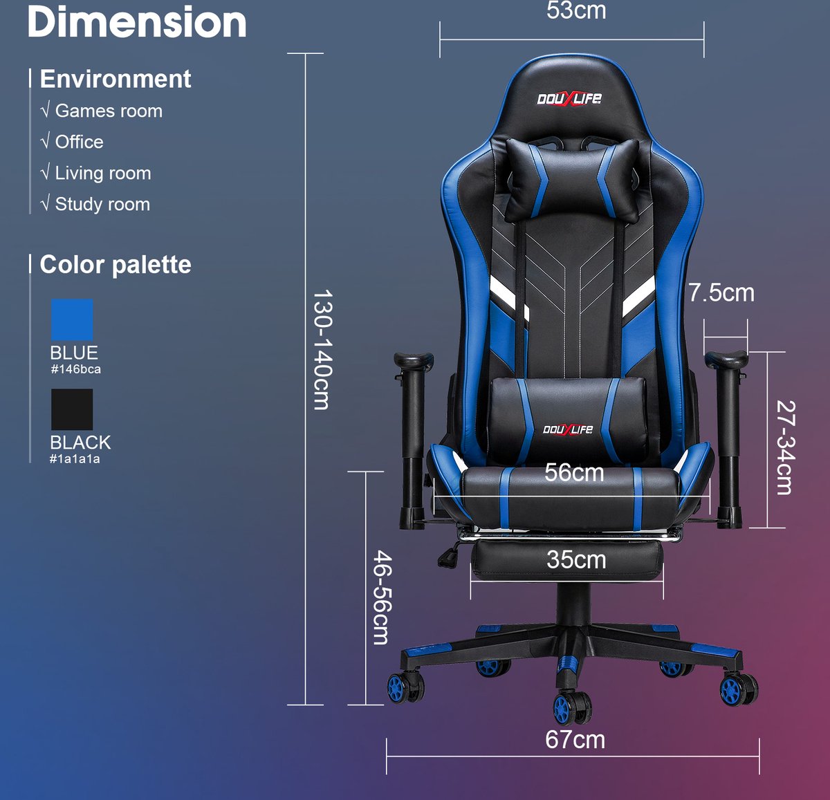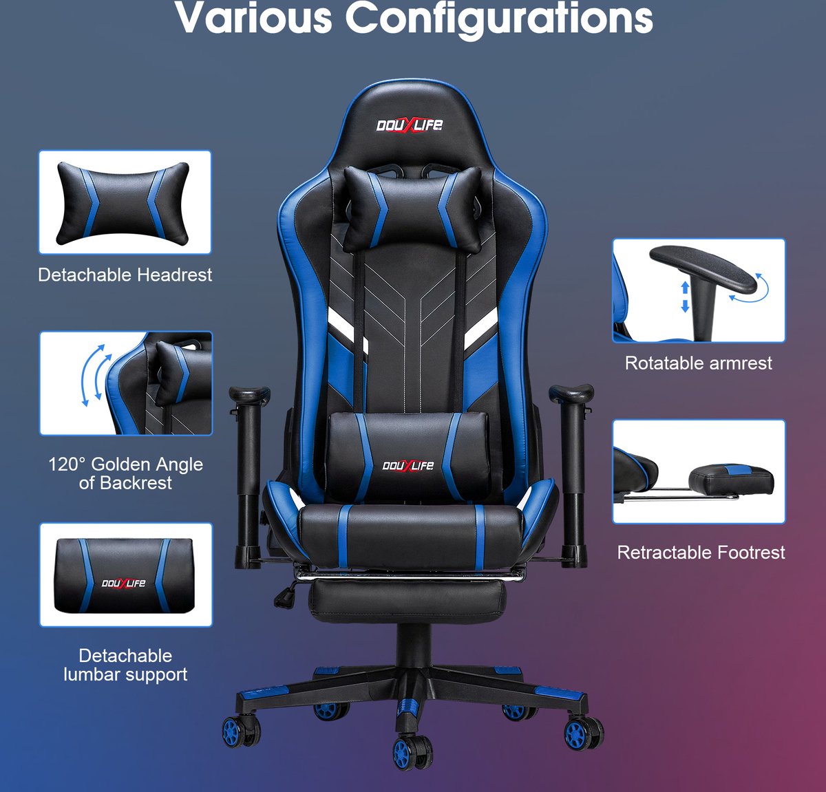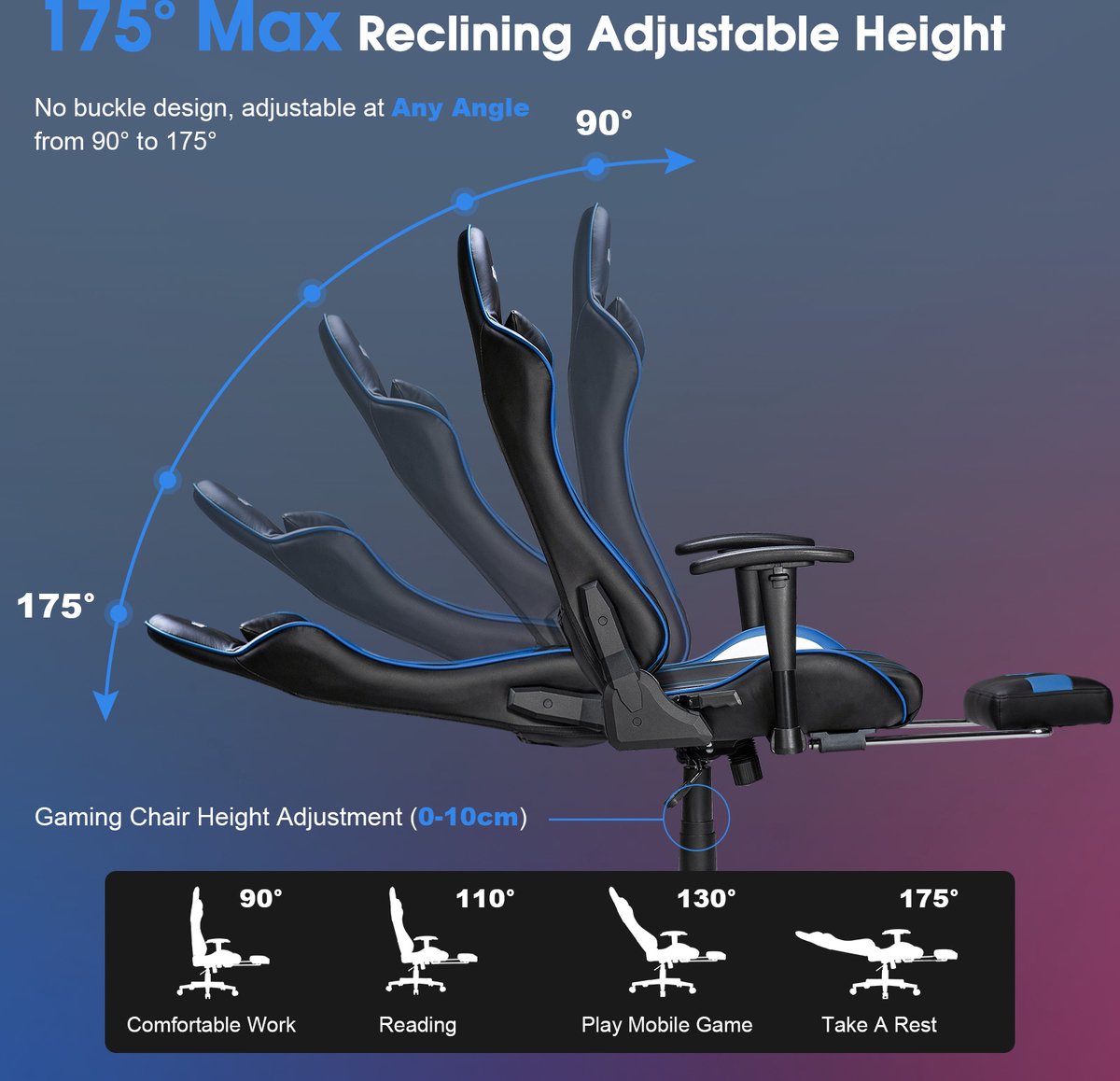 [MULTI-FUNCTIES] Dit is een gamestoel met voetsteun en een gamestoel met massagefunctie. Comfortabel en ergonomisch ontwerp, het product heeft de kenmerken van 360-graden rotatie, verstelbare hoogte (10 cm), intrekbare voetsteun, verstelbare hoofdsteun, hoek aanpassing (Max 175 °), tilt mechanisme.Deze Reclining stoel kan de meest comfortabele ervaring of het wordt gebruikt in het kantoor of in het spel, en het dubbele van uw efficiëntie.