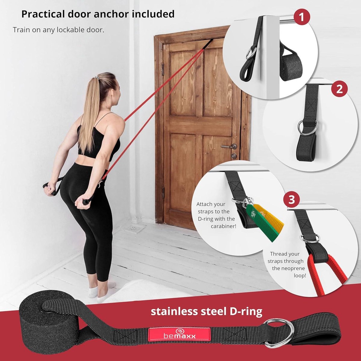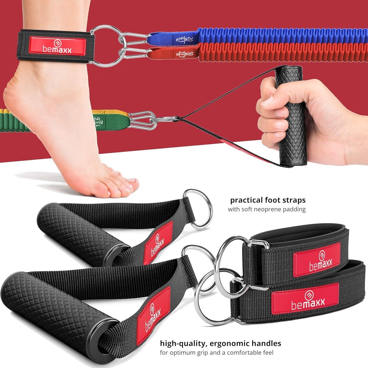- Set bestaat uit 5 weerstandsbanden, 2 slipvaste handgrepen, 2 neopren-enkelbanden, 1 premium deuranker en 1 draagtas