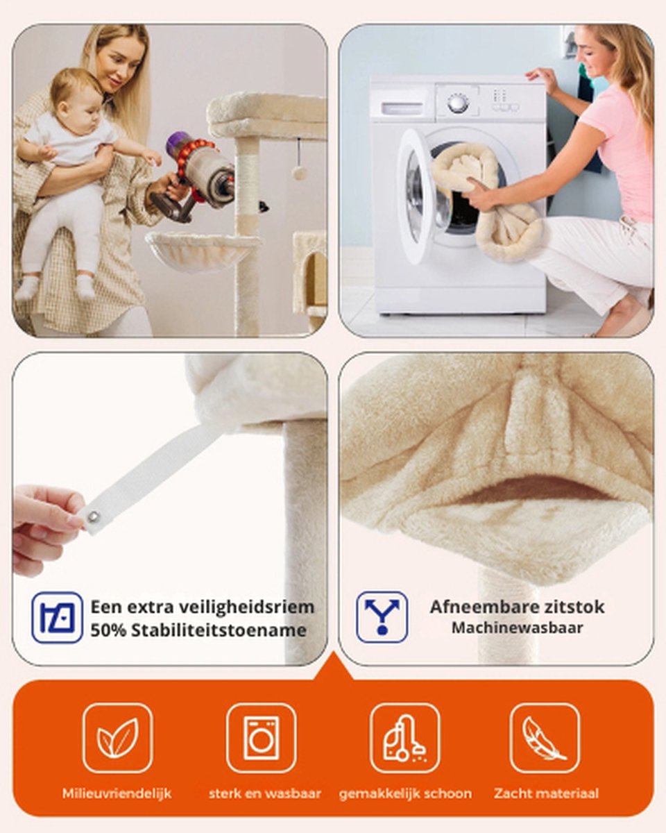 - De kattenboom is uitgerust met een ruim appartement, een grote hangmat, een gezellige pluche topbaars en stevige sisal-overdekte krabpalen. Dit alles zorgt ervoor dat je kat zich kan uitleven, spelen en tegelijkertijd heerlijk kan ontspannen.