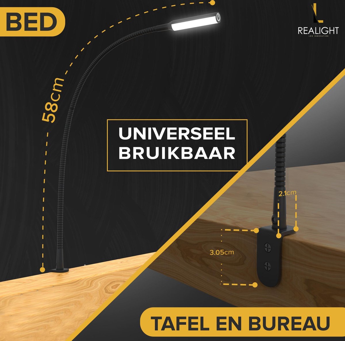 Realight Leeslamp Bed met Dimfunctie – Bedlampjes leeslampjes Volwassenen Slaapkamer – Leeslampje Boxspring – Bedlamp Dimbaar – Hoofdbord Boeklamp – Touchlamp – Nachtlamp – Nachtkast Lamp – Hoofdbord Bedlampje Zwart – 2.5 meter Snoerlengte – 58 cm