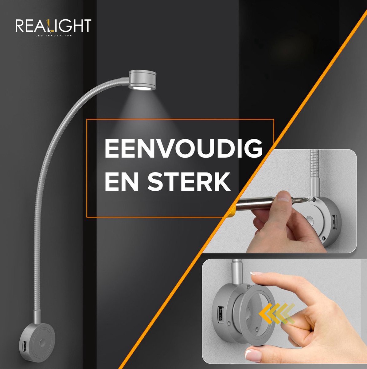 De Realight Leeslamp is volledig draaibaar tot 360 graden en wordt geleverd met alle benodigde bevestigingsmaterialen voor een eenvoudige montage aan ieder hoofdeinde.