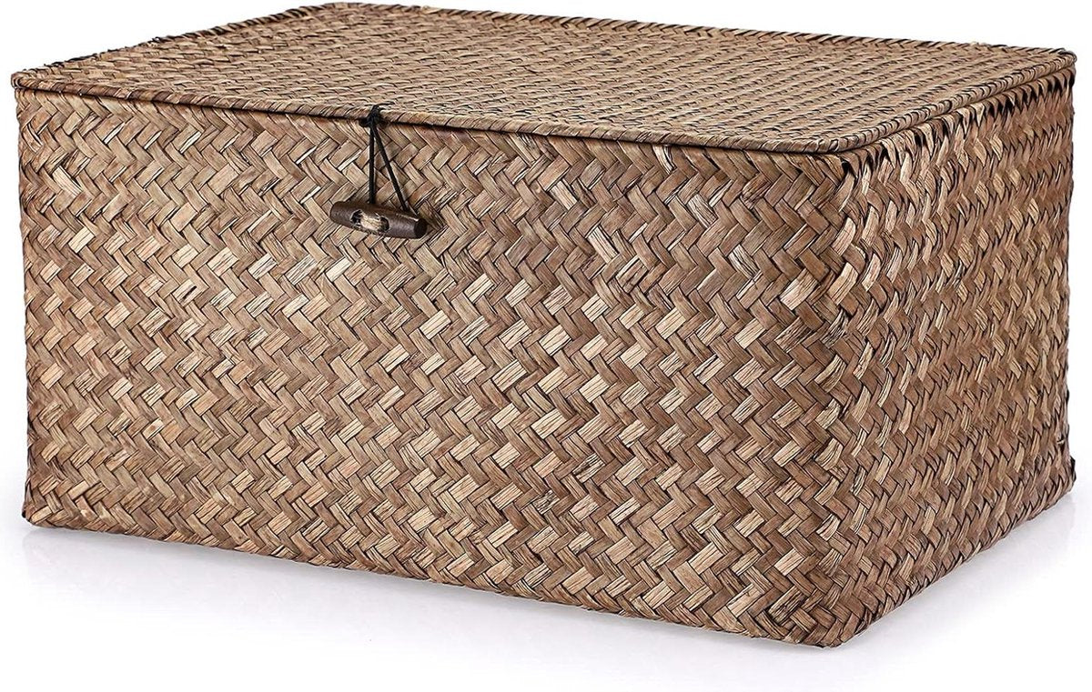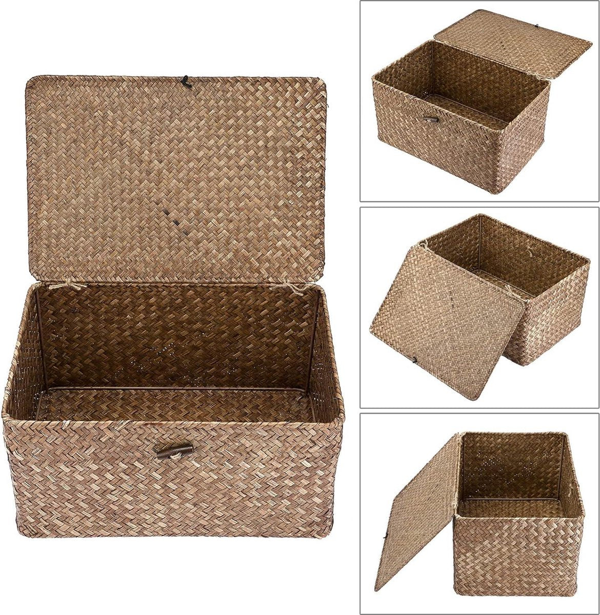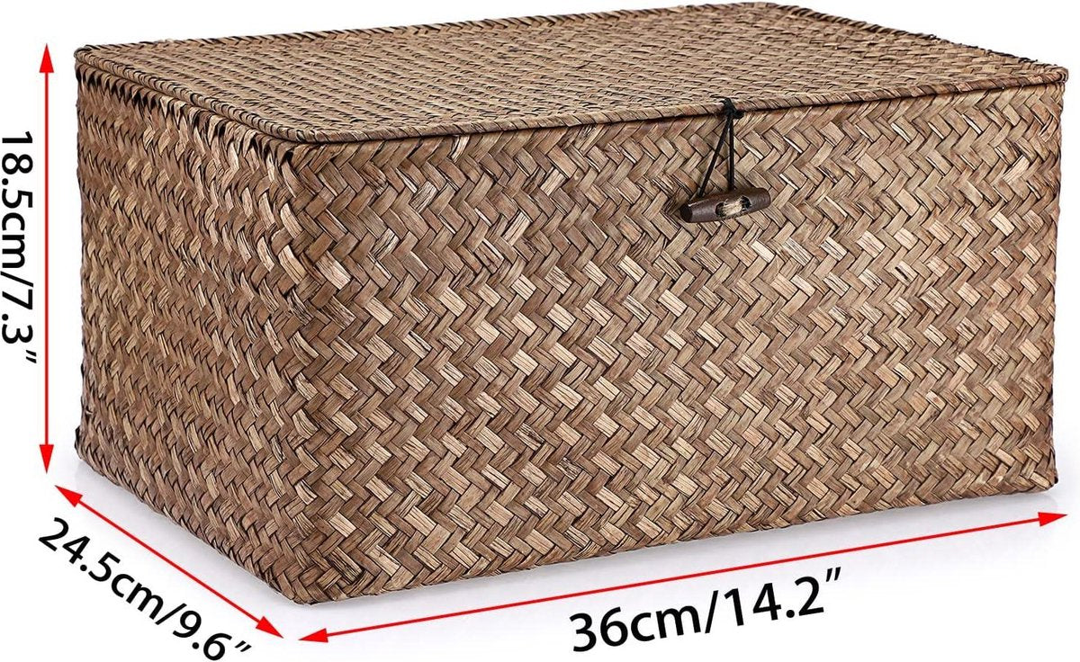 Rieten mand met deksel Sweet Living Opbergmand van zeegras voor bureau en badkamer - geweven zeegras opbergdoos planken - decoratieve mand - multifunctionele opbergmand - koffie groot Rieten mand met deksel sweet living