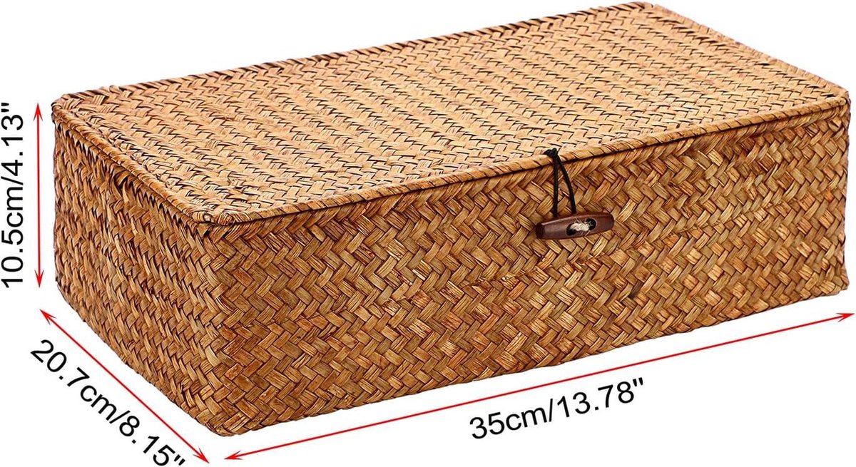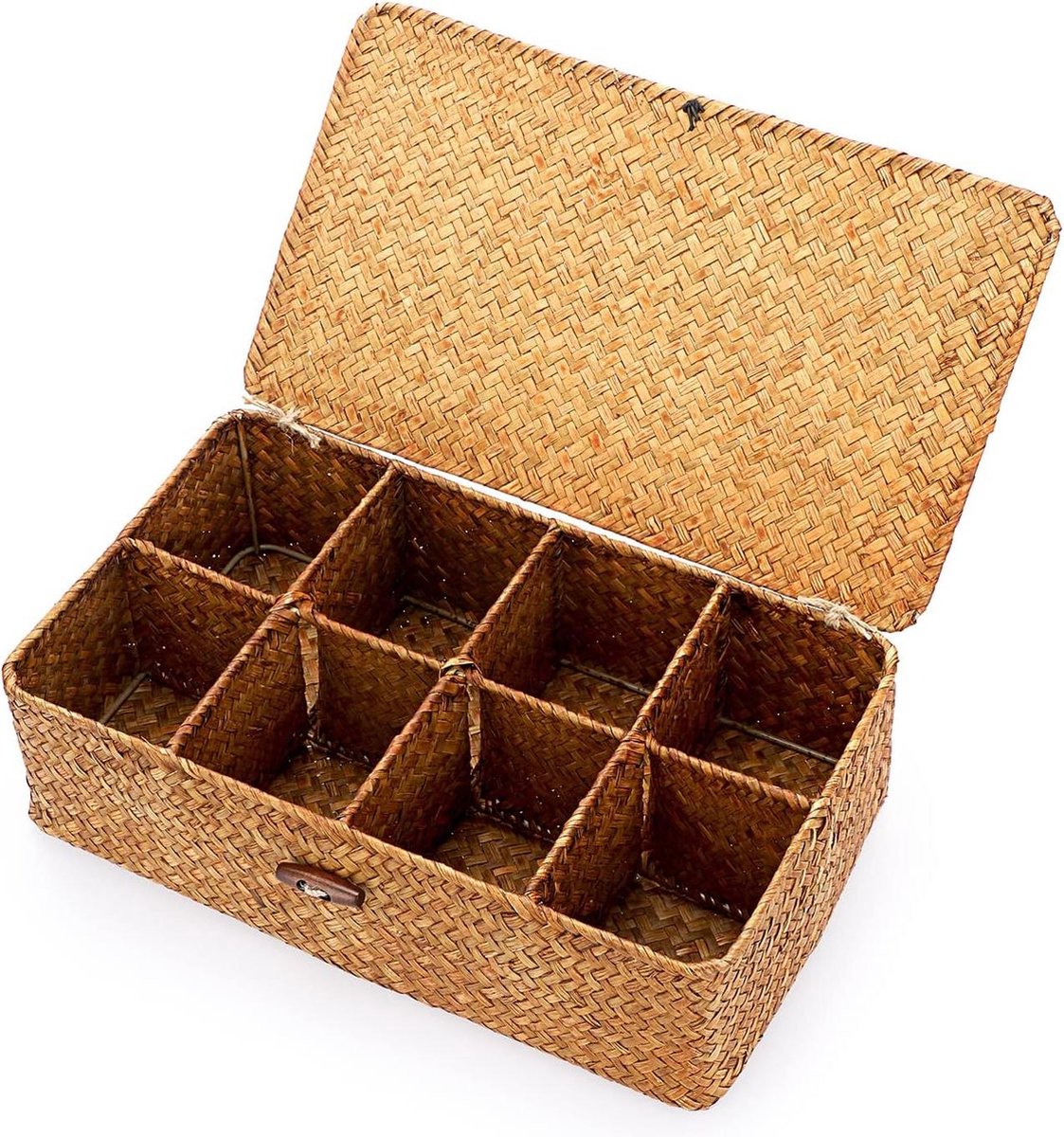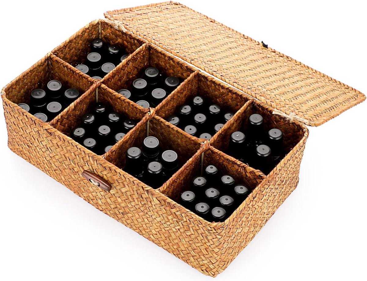 Rieten mand opbergmand met deksel 8 vakken tafelorganizer karamelkleurig