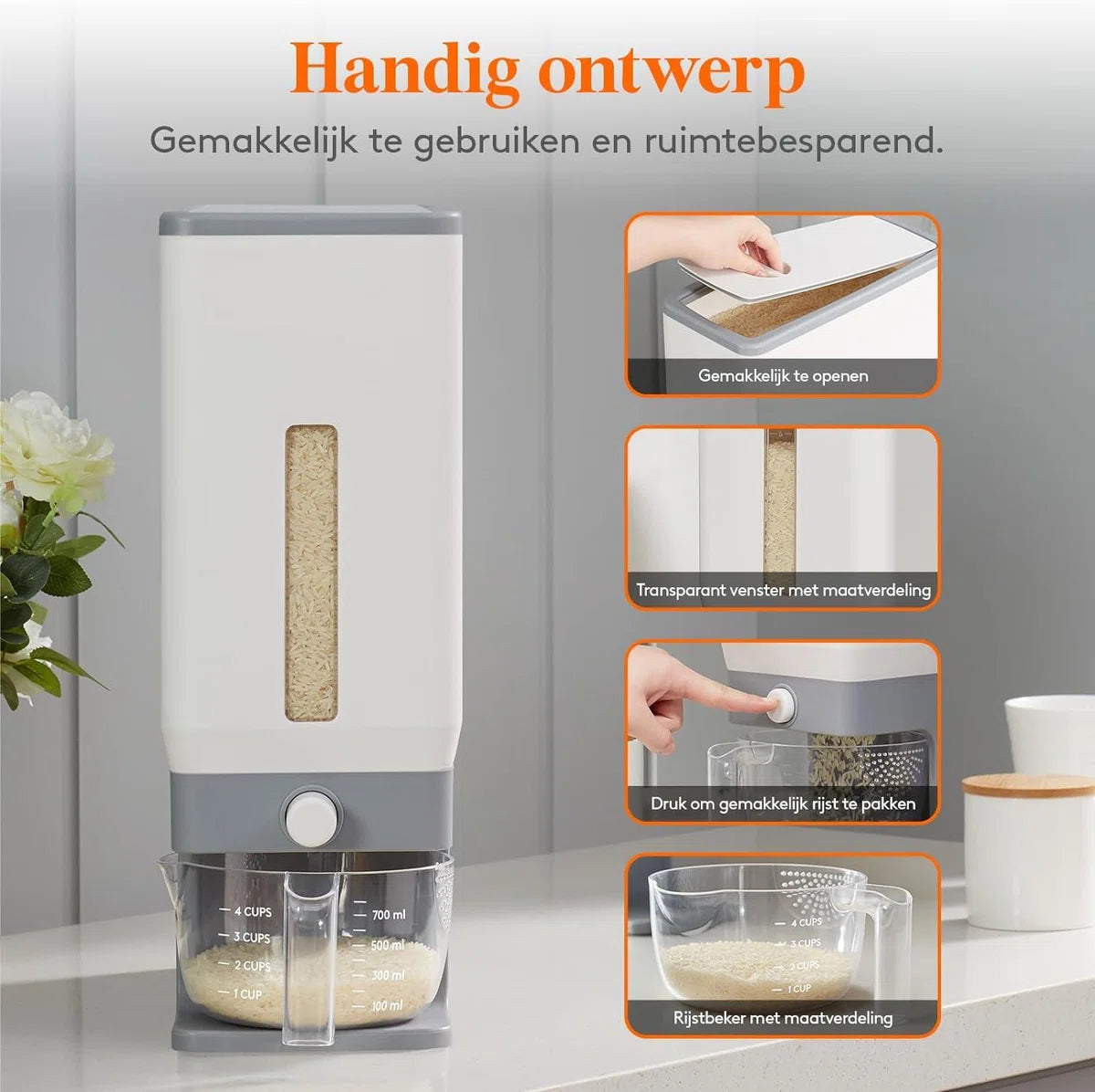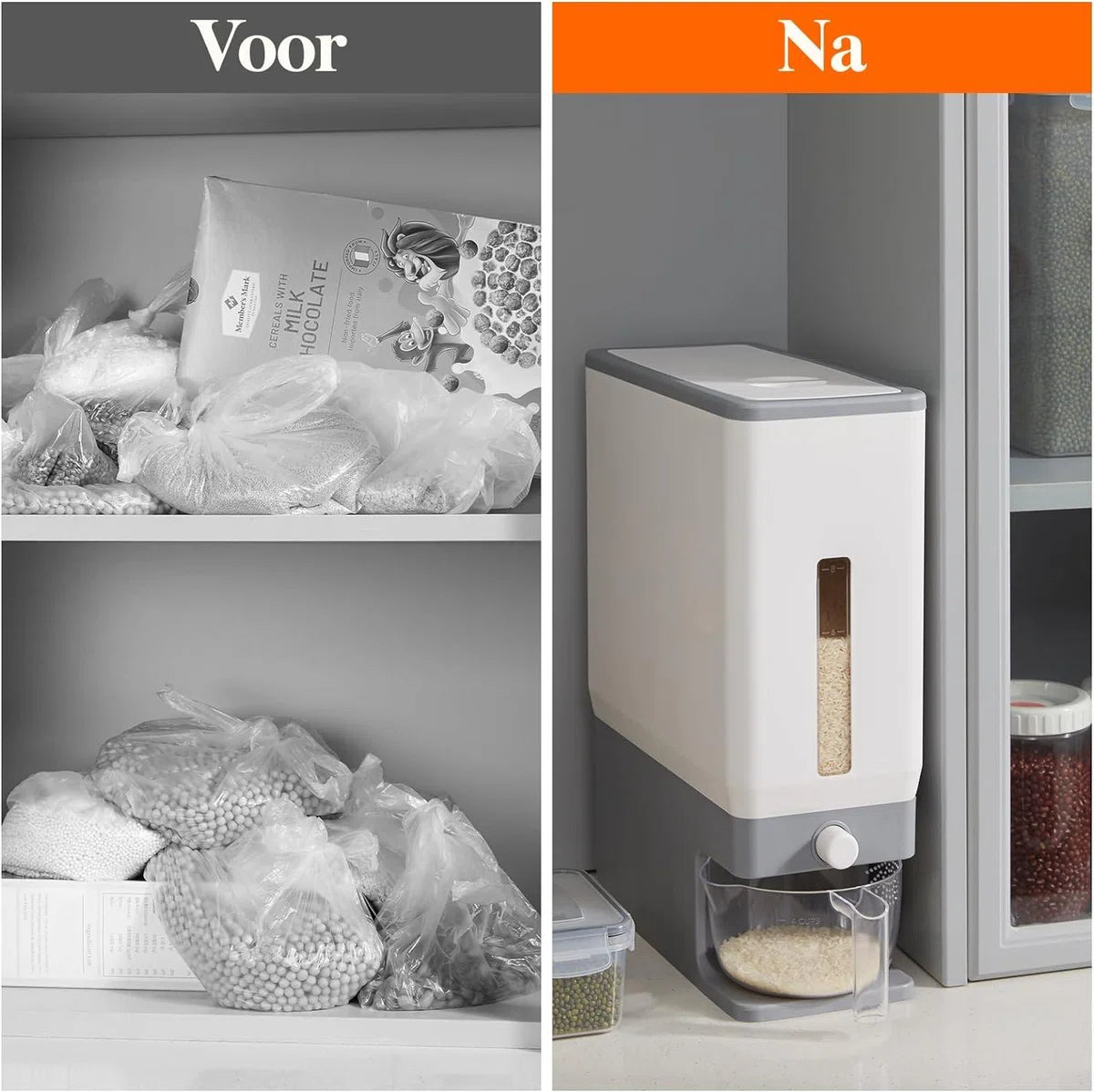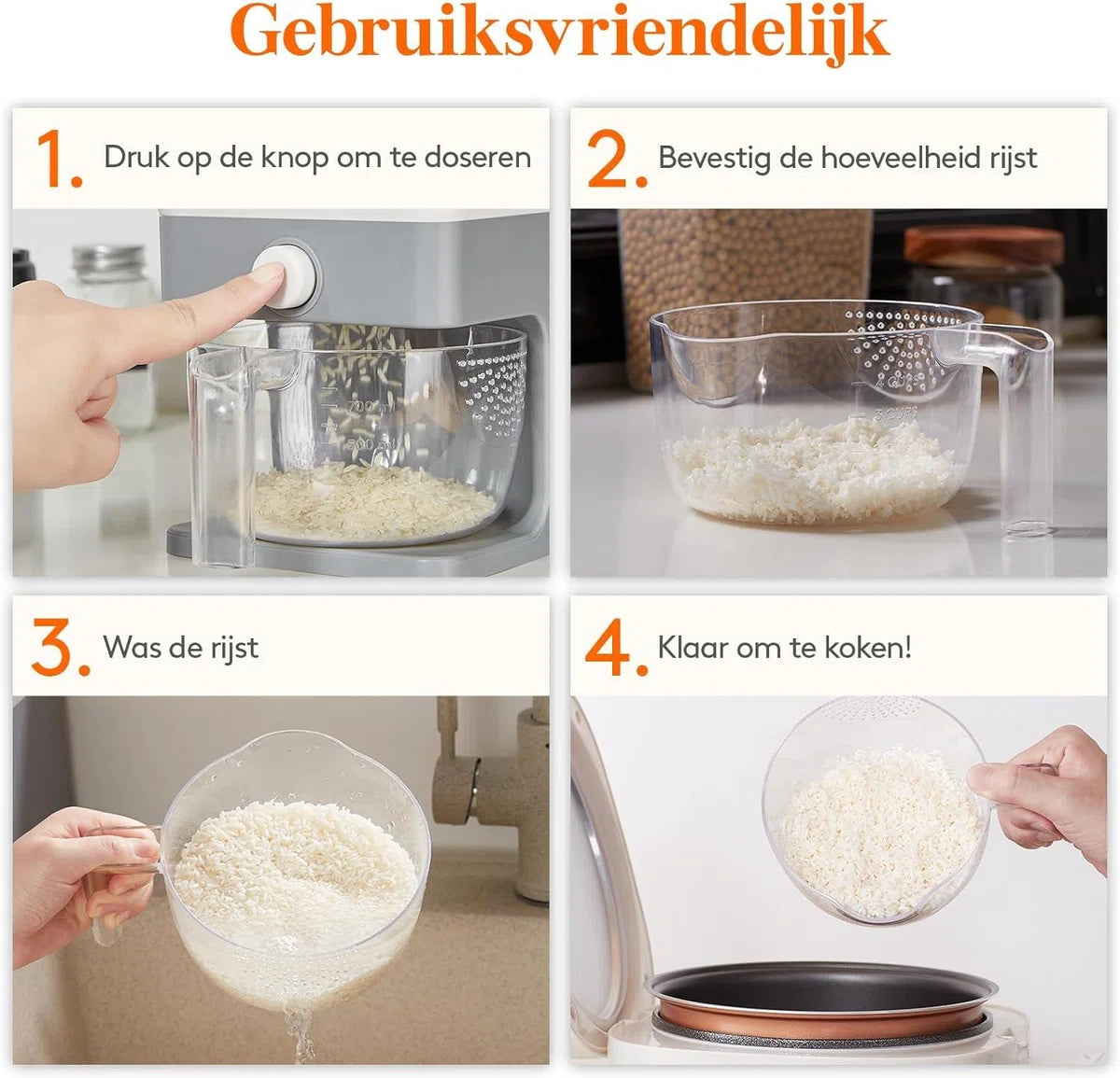 Deze rijstdispenser is een must-have voor in de keuken! Met een grote capaciteit van 11,3 kg kun je genoeg rijst bewaren terwijl het schoon en vers blijft. Daarnaast is deze graandispenser gemaakt van hoogwaardig PP-materiaal en heeft een uitstekende luchtdichtheid, waardoor je granen lang vers blijven en beschermd zijn tegen geurtjes.De bediening van deze rijstdispenser is zeer gebruiksvriendelijk: druk op de knop om de rijst te doseren en laat de knop los om te stoppen. De transparante maatverdeling op zowel de dispenser als de bijgeleverde maatbeker maakt het eenvoudig om de hoeveelheid rijst te controleren en af te meten. Bovendien is de dispenser gemakkelijk te demonteren en schoon te maken voor optimaal gebruiksgemak.De multifunctionele maatbeker die wordt meegeleverd is handig voor diverse doeleinden. Met zijn transparante ontwerp en duidelijke maatstreepjes kun je nauwkeurig de rijst afmeten. De randen van de beker zijn voorzien van kleine gaatjes waardoor je de rijst direct kunt wassen, waardoor het een veelzijdige toevoeging aan je keuken is.Dankzij het slanke en stijlvolle ontwerp is deze rijstdispenser ook ruimtebesparend. Het past perfect bij verschillende woonstijlen en neemt niet veel ruimte in beslag in de keuken. Een praktisch en handig keukenaccessoire! Productspeficiaties: - Materiaal: PP - Capaciteit: 11,3 kg - Kleur: Transparant - Inhoud verpakking: 1 x rijstdispenser, 1 x maatbeker