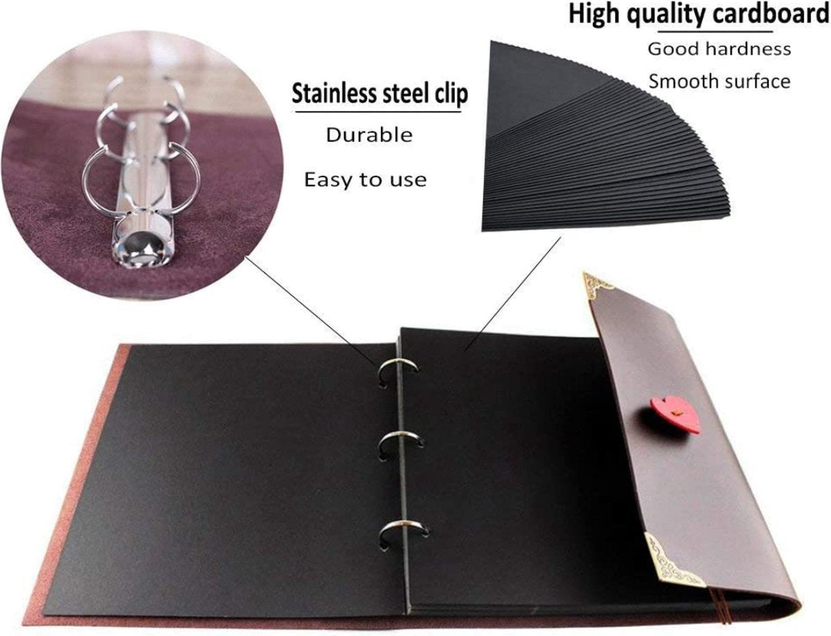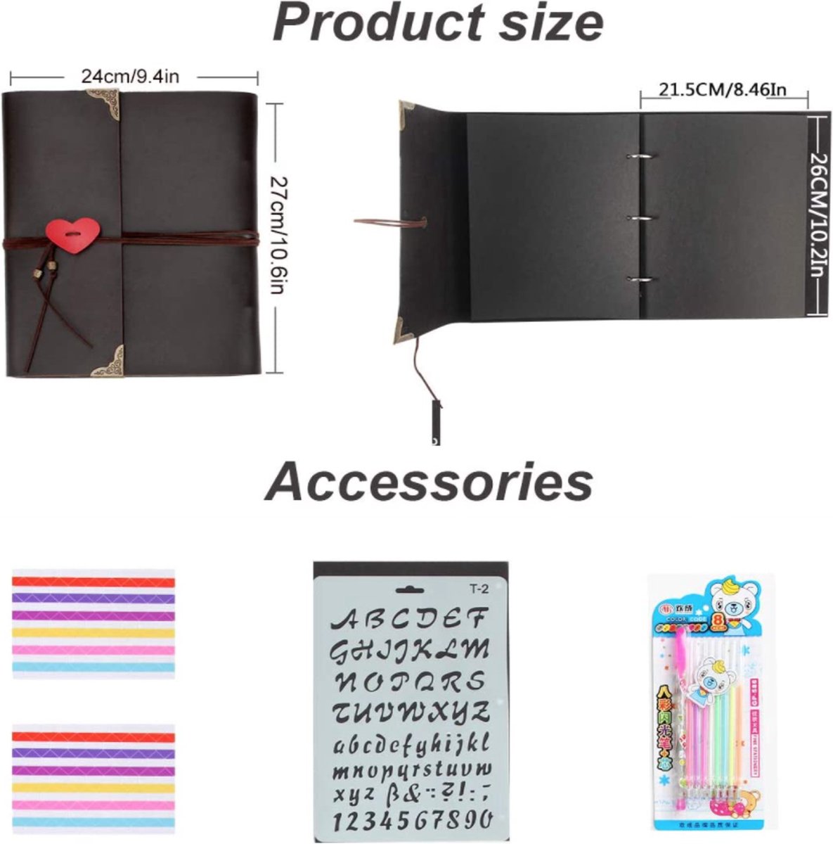 Plakboek formaat 27 x24 cm. Het heeft 30 zwarte vellen papier/60 pagina's. De zwarte pagina's hebben een formaat van 26 x 21,5 cm, perfect om meer dan 100 stukjes 6x4 of 7x5 inch foto's te bewaren en ruimte op het zwarte papier over te hebben om te schrijven.