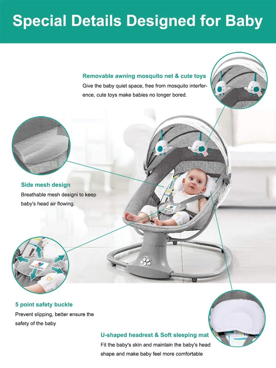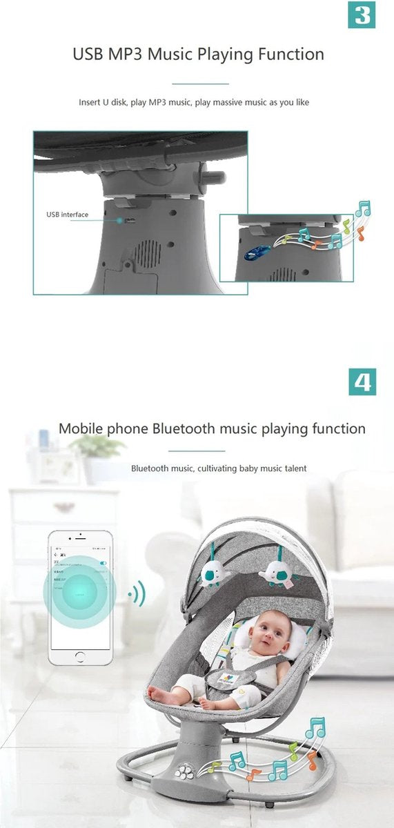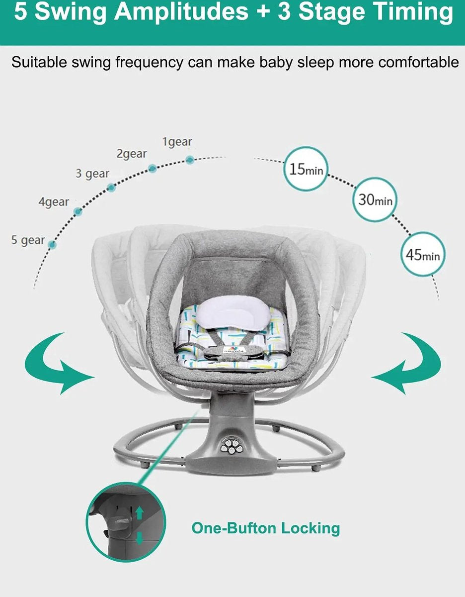 Met meerdere functies zoals muziekopties, is het niet alleen een wiegstoel maar ook een interactieve plek voor de baby. De automatische wiegbeweging zorgt ervoor dat je zonder moeite je baby rustig houdt, perfect voor zowel dutjes als speelmomenten.