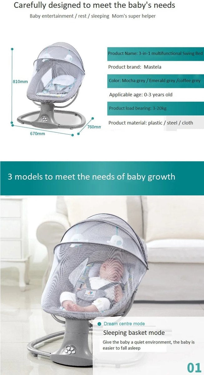Introduceer rust en comfort voor je baby met de RM Store® Elektrische Schommelstoel. Ontworpen voor ultieme ontspanning, biedt deze veelzijdige schommelstoel een combinatie van moderne technologie en klassiek wiegcomfort, zodat je kleintje zachtjes in slaap kan vallen. De ideale aanvulling voor elke babykamer.