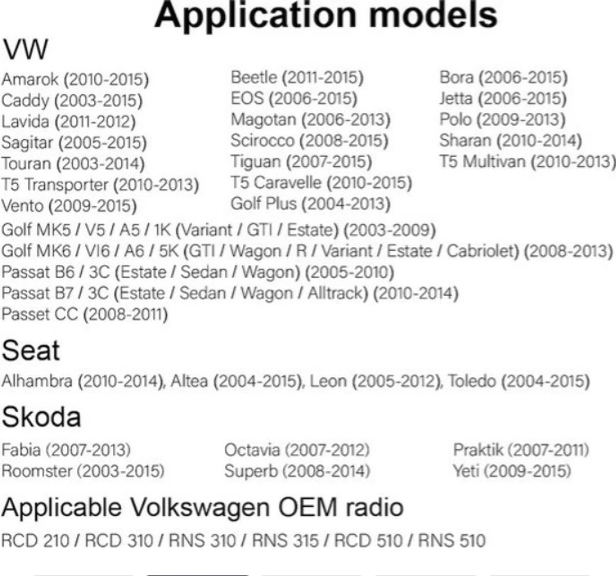 • Geschikt voor Volkswagen, Skoda en Seat modellen (zie lijst hieronder)