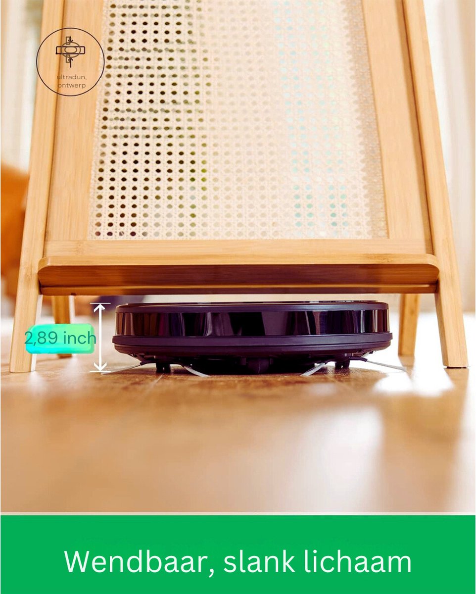 Geen Onbereikbare Hoekjes, Grondige Reiniging: De draadloze stofzuiger klimt moeiteloos tot 15° hoogte voor ononderbroken reiniging op harde vloeren en tapijten. Met slechts 2.89 inch hoogte en 360 graden wendbare wielen, glijdt de robot eenvoudig onder meubels door en langs hoeken, waardoor je hele huis diepgaand wordt gereinigd.
