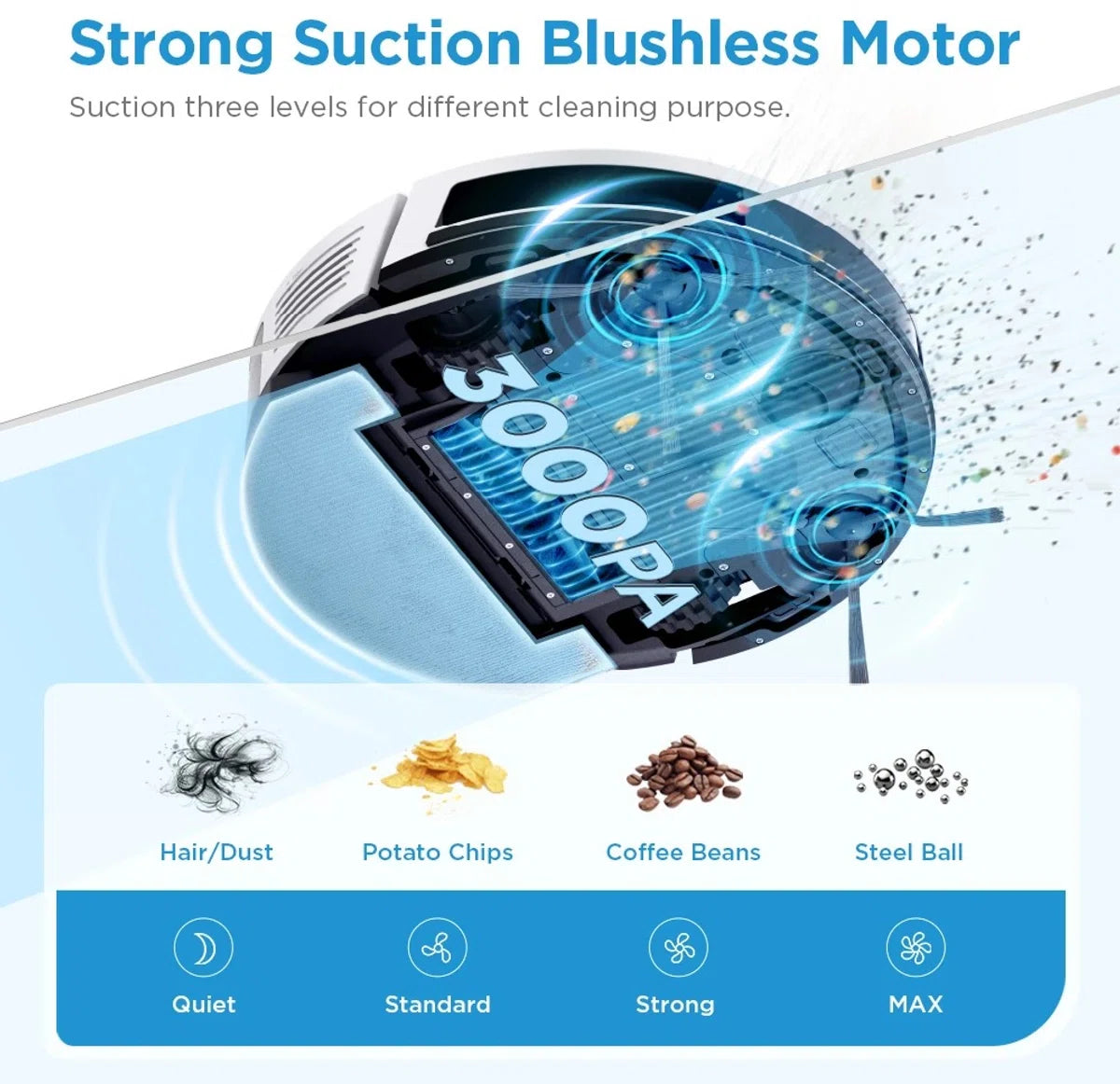 Met een indrukwekkende zuigkracht van 3000Pa verwijdert de Robotstofzuiger moeiteloos vuil, stof en haren van zowel harde vloeren als tapijten. Jouw vloeren blijven brandschoon, ongeacht het type vuil.