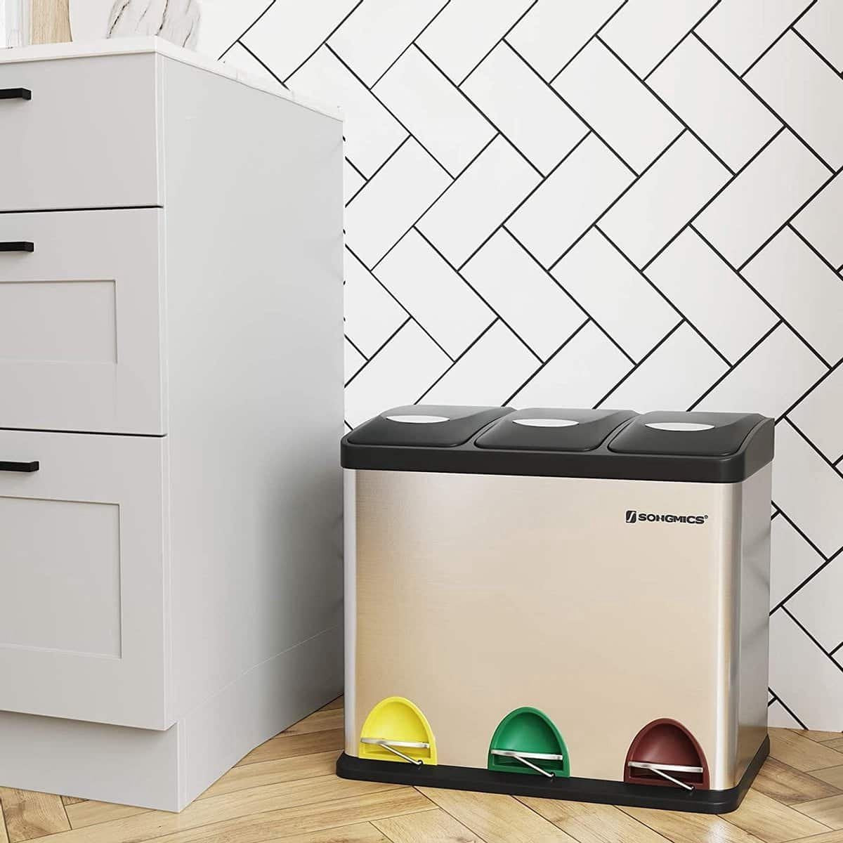 Deze pedaalemmer met 3 vakken is een must-have voor iedereen die zijn keuken netjes en georganiseerd wil houden, terwijl hij ook bijdraagt aan milieubewust afvalbeheer.