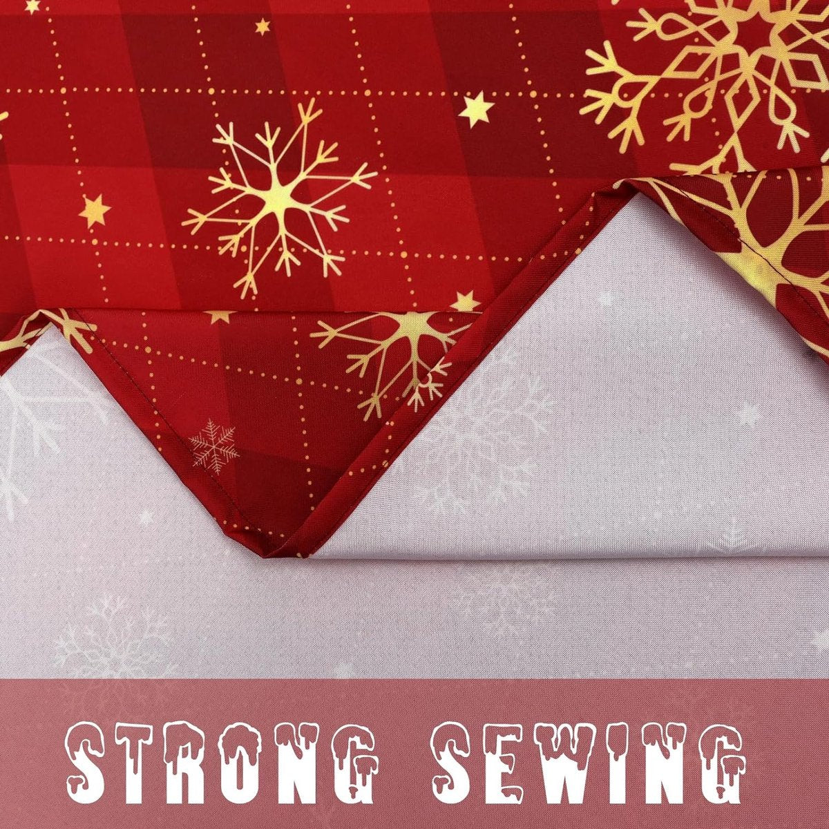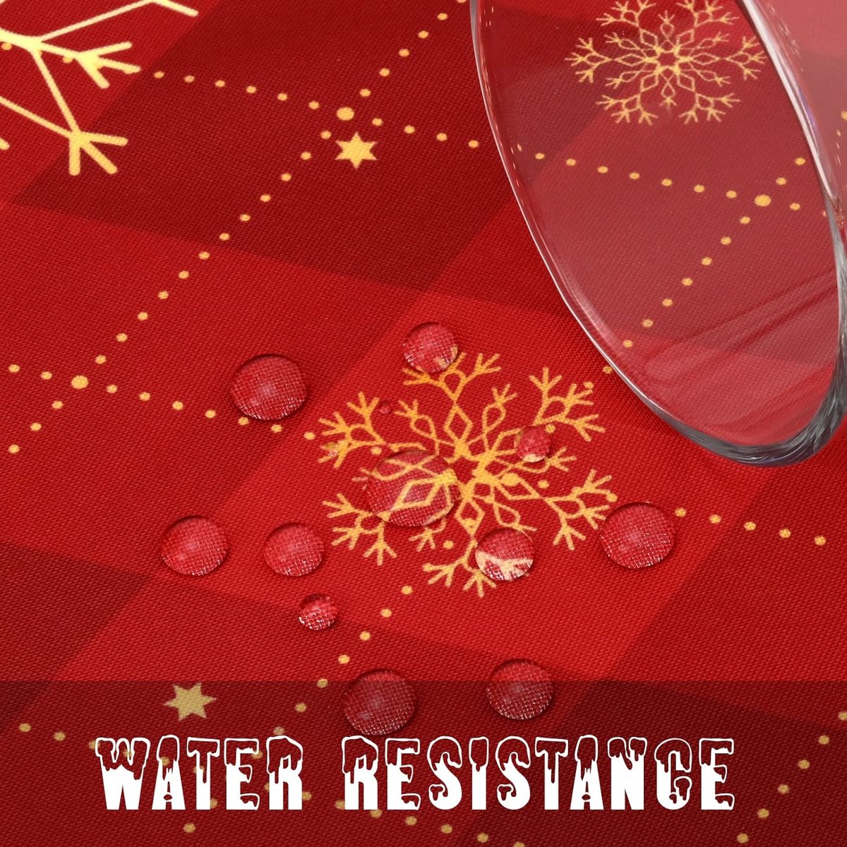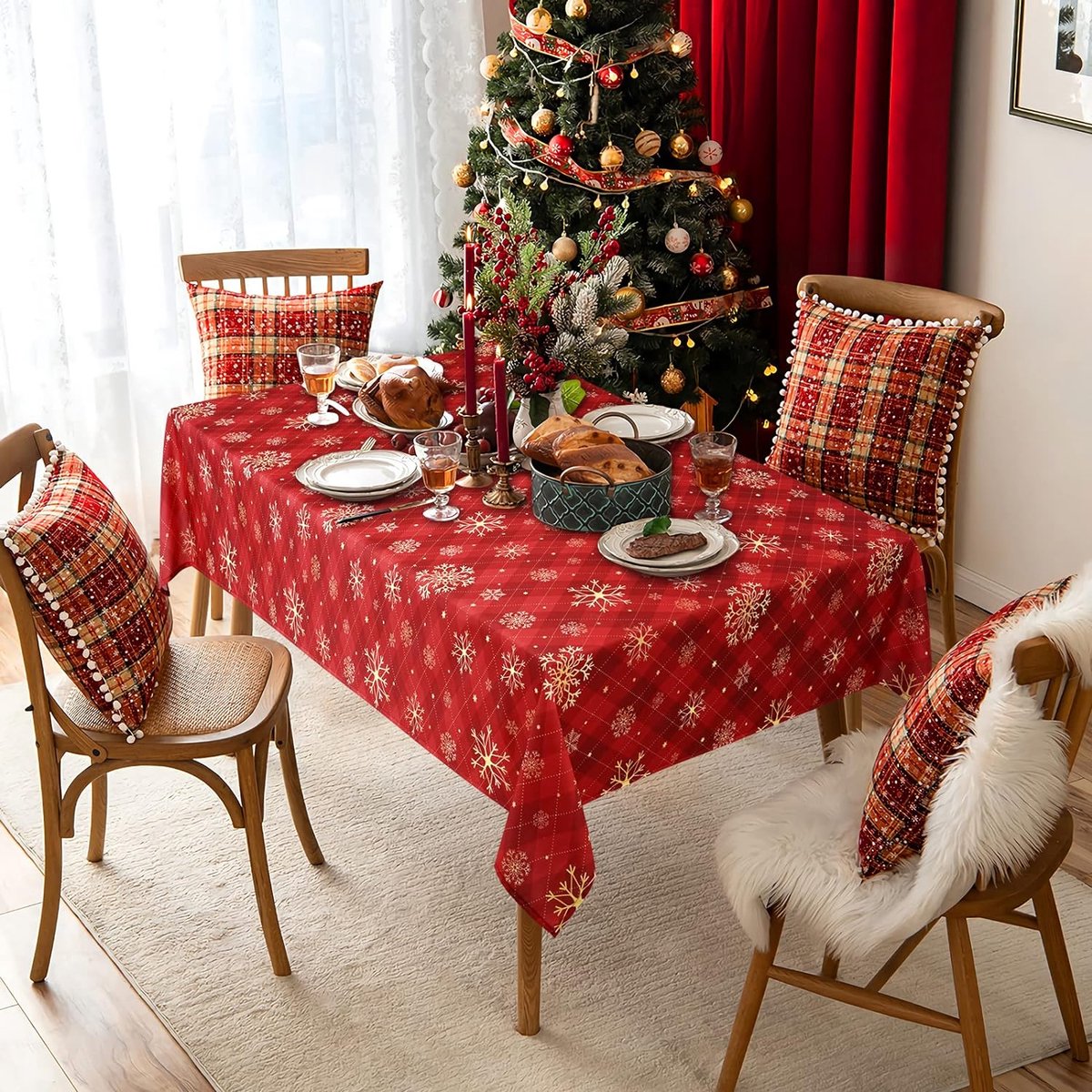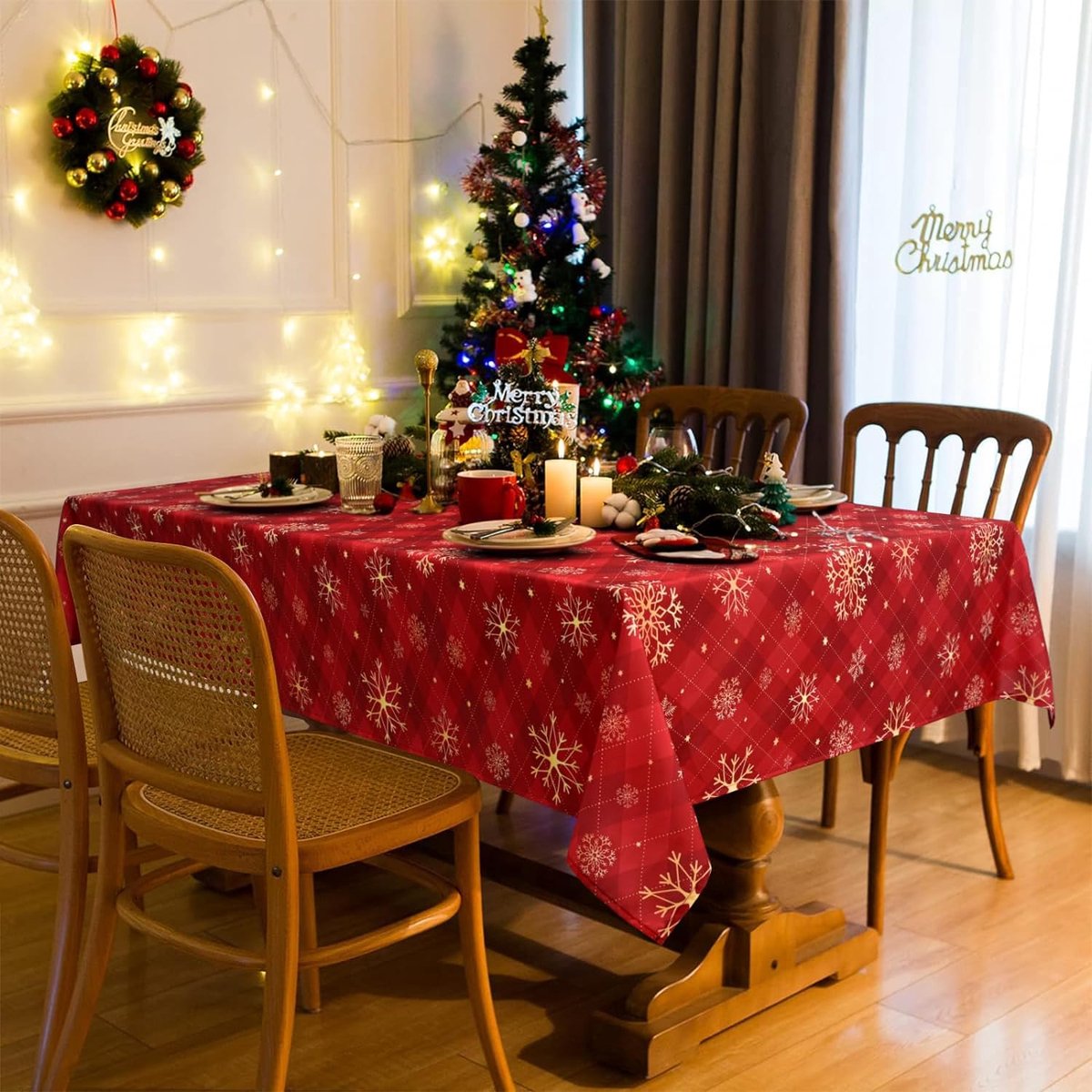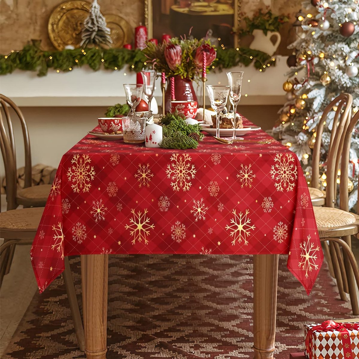 Rood Kerstmis tafelkleed, gele sneeuwvlokken, geruit tafelkleed, rechthoekig, waterdicht lotuseffect, afwasbaar tafelkleed voor vakantie, eettafel, winter, party, 130 x 220 cm