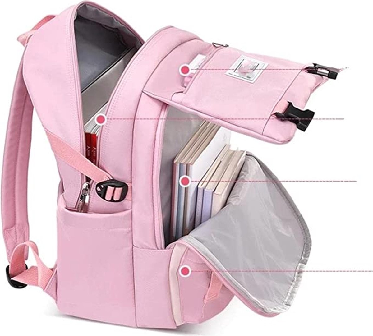 - Multifunctioneel: de rugzak kan gebruikt worden als reisrugzak, schoolrugzak, universiteitsrugzak, werktas,... Spullen zoals laptop, iPad, boeken, kleding, portefeuille, mobiele telefoon, sleutels, paraplu, make-uptas, A4-artikel enz. kunnen allemaal meegenomen worden in deze rugzak.