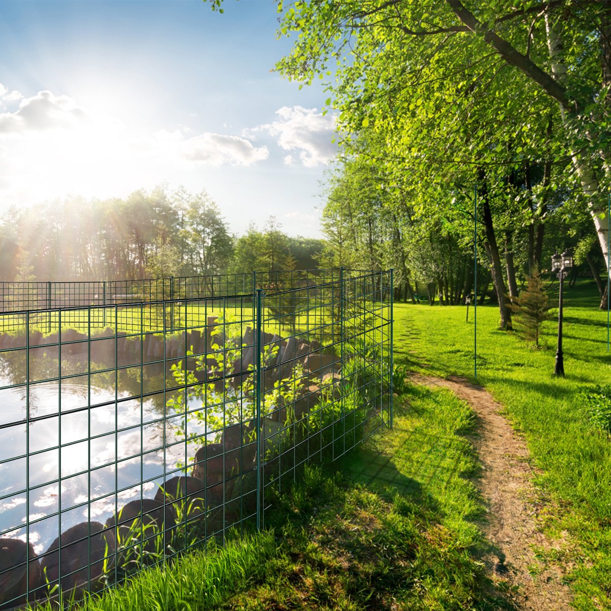 De vijverafscheiding met een donkergroene boogvormige bovenkant is ideaal om structuur toe te voegen aan je tuin. Dankzij het praktische insteeksysteem kan de omheining op elk moment worden verplaatst of verwijderd. Het insteekhek is heel eenvoudig te bevestigen en vast te maken aan de grond zonder dat er funderingen of speciaal gereedschap nodig is. Dankzij het flexibele systeem is dit zelfs tijdens de bouw geen probleem. Dit type omheining kan dus zowel als decoratief element worden gebruikt als om te voorkomen dat kleine kinderen en honden in de vijver of andere delen van de tuin komen. Je kunt de insteekomheining ook gebruiken als dierenverblijf, om konijnen of cavia's een veilige uitgang te bieden.