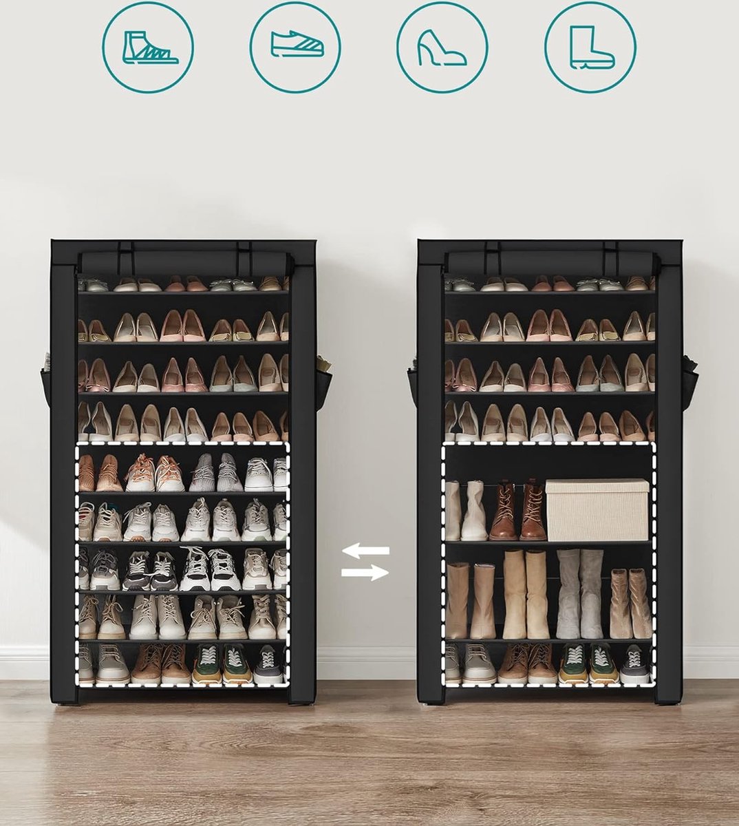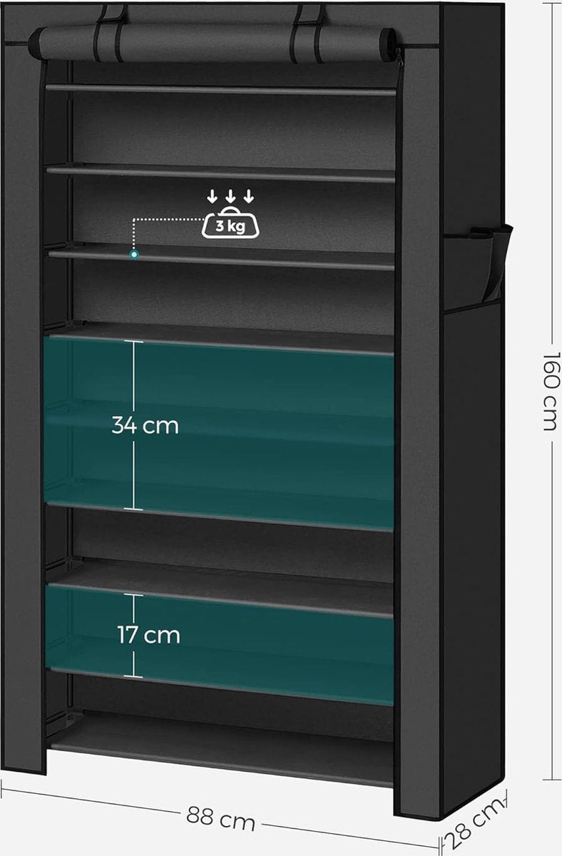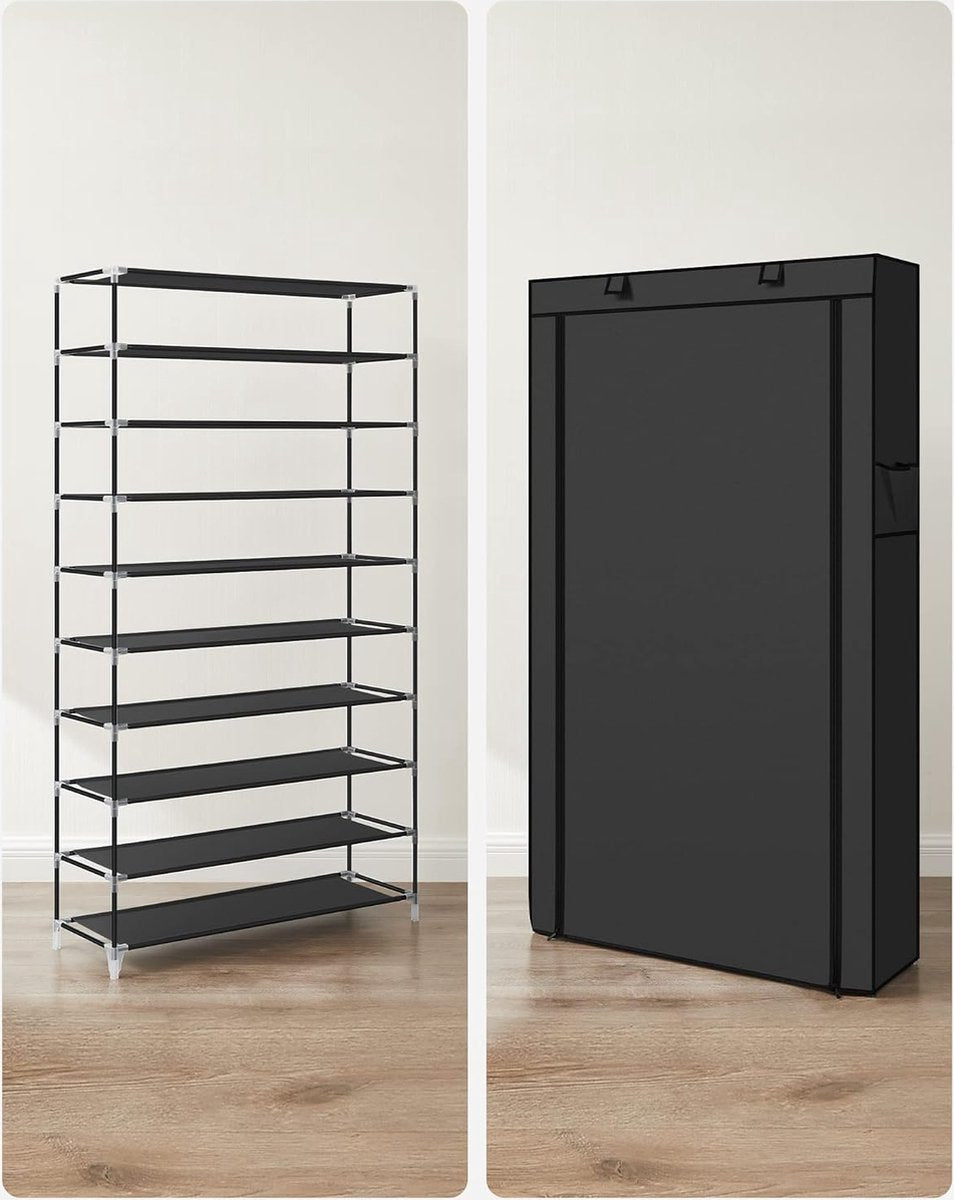 - Stofvrij ontwerp: Dit schoenenrek is voorzien van een stoffen hoes met ritssluiting en klittenbandsluiting, waardoor je schoenen gemakkelijk kunt opbergen en beschermen tegen stof.