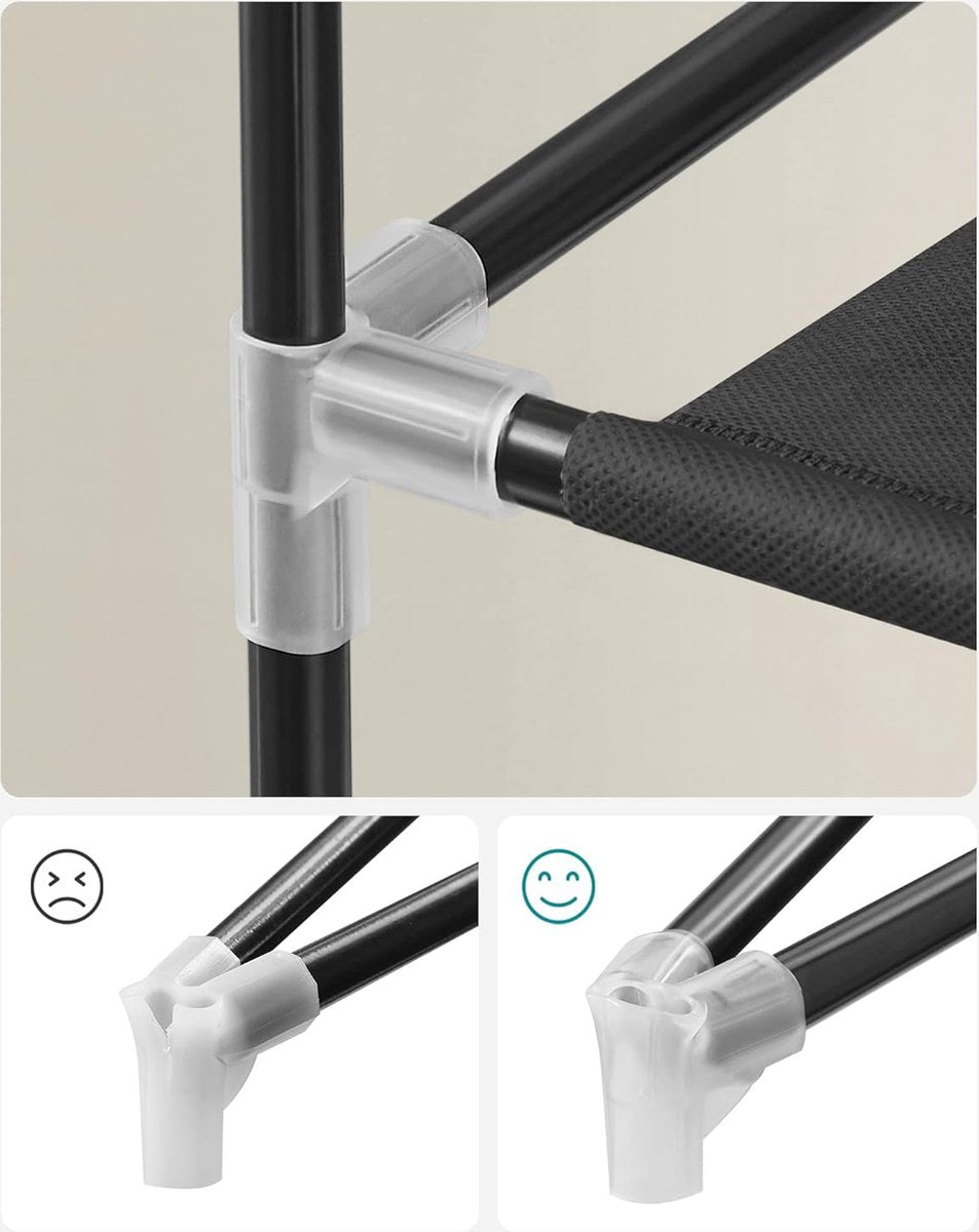 De montage van het schoenenrek is eenvoudig en snel. Je hoeft alleen de buizen in de plastic fittingen te steken, zonder extra gereedschap. Binnen enkele minuten heb je een stabiel en stevig schoenenrek klaar voor gebruik.