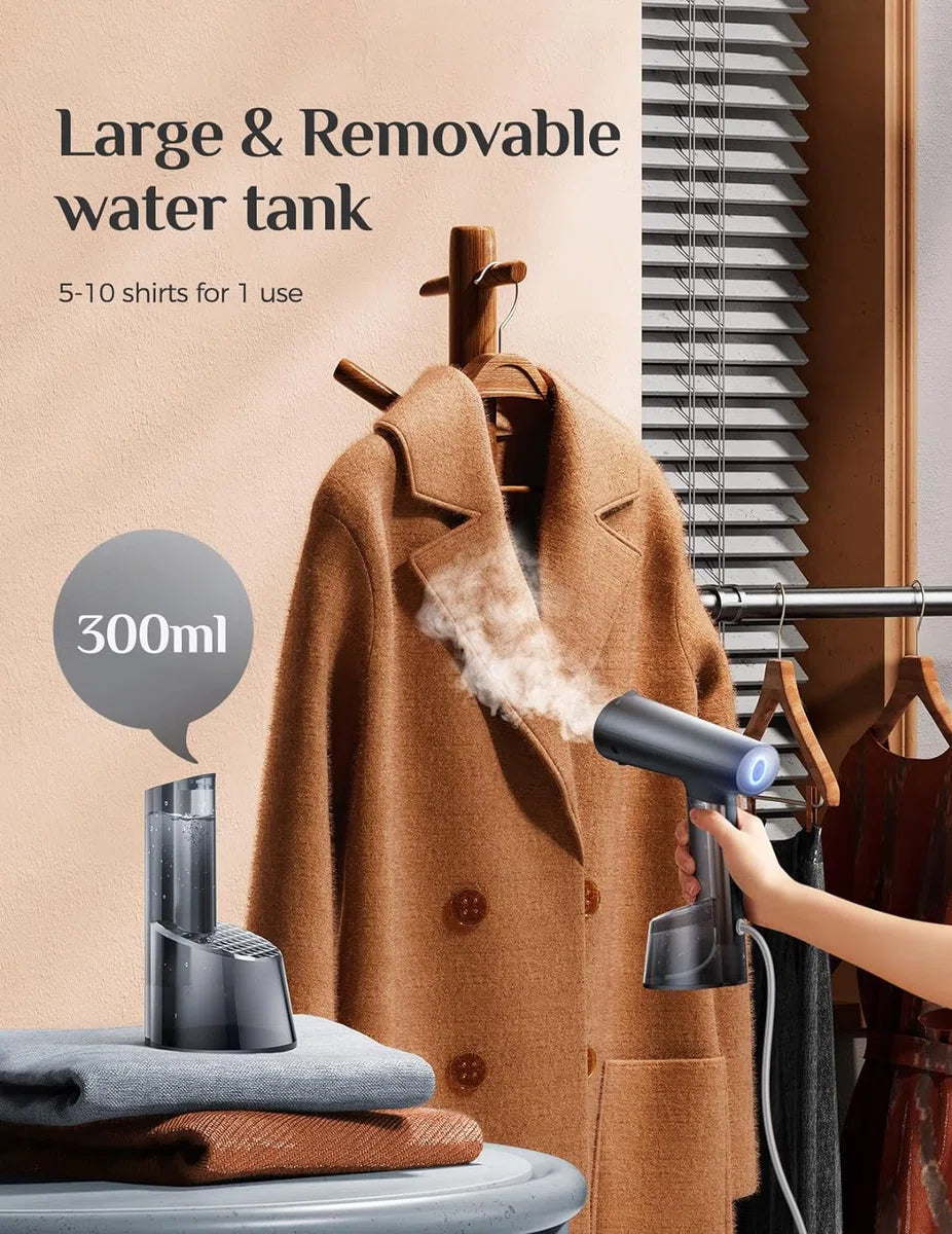 Snel Opwarmend en Efficiënt Deze kledingstomer heeft slechts 20 seconden nodig om op te warmen, dankzij zijn krachtige verwarmingselement. Uitgerust met een grote, afneembare watertank van 300 ml, biedt het apparaat tot 25 minuten aan continue stoom, ideaal voor het snel en gemakkelijk verwijderen van kreukels.