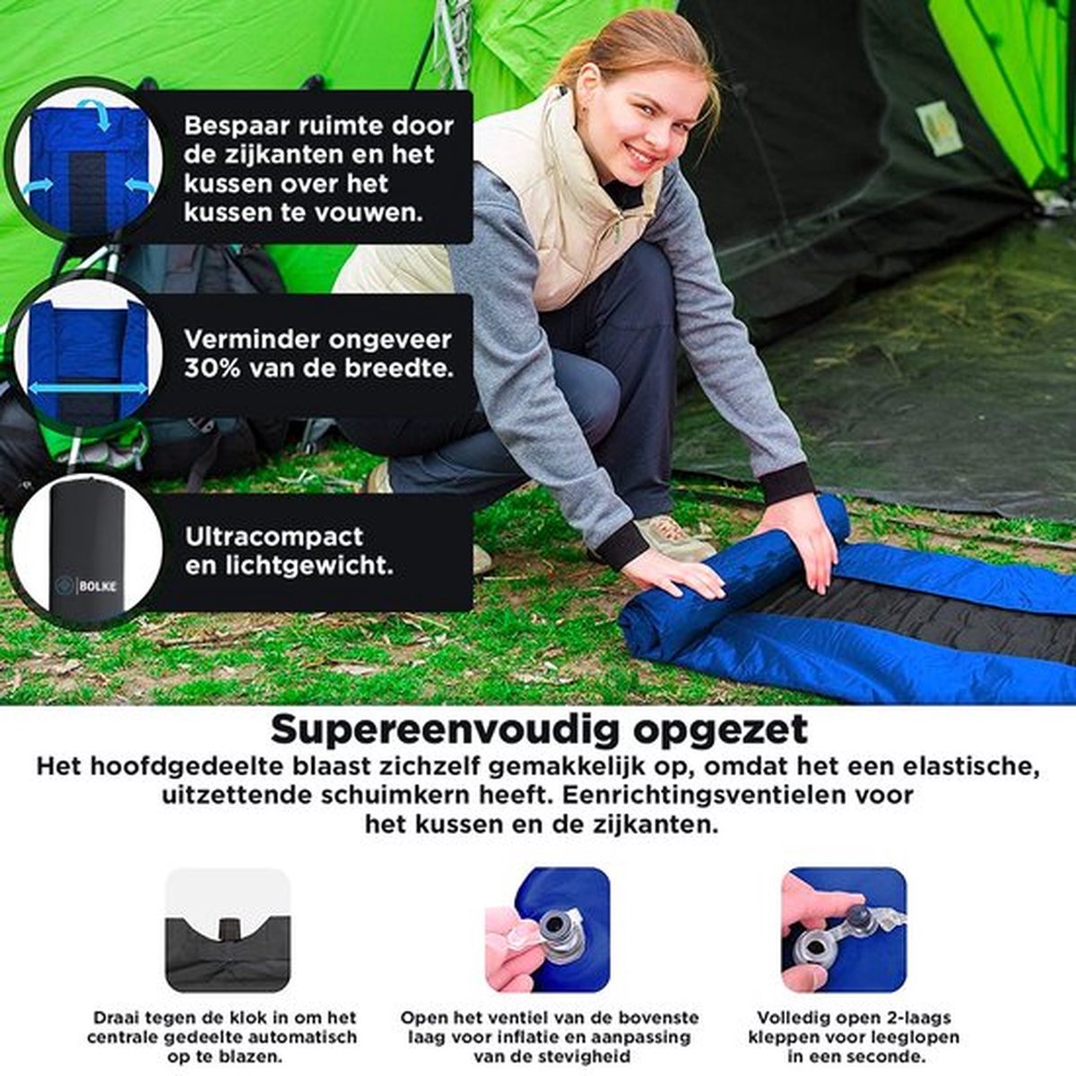 Zijleuning voor Extra Ondersteuning: Geniet van een verhoogd gevoel van veiligheid en comfort dankzij de zijleuning van ons slaapmatje. Of je nu onder de sterrenhemel ligt te genieten of in een tent slaapt, de zijleuning biedt stabiliteit en voorkomt dat je 's nachts van je matje rolt.