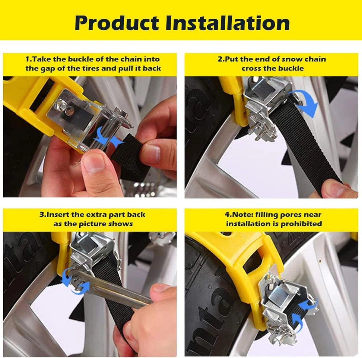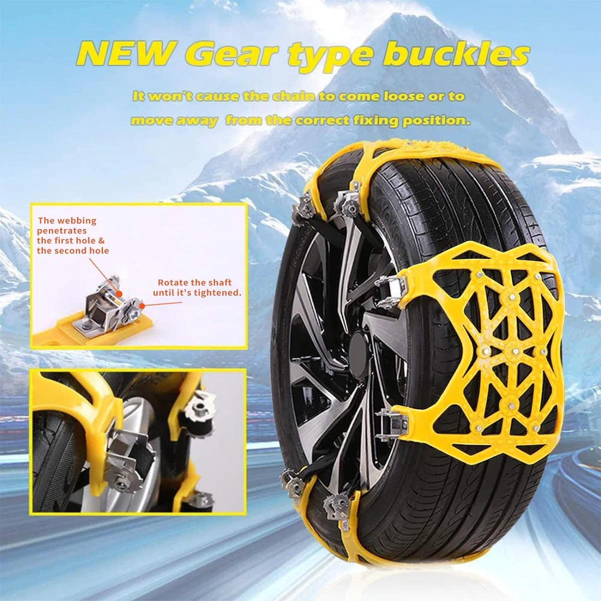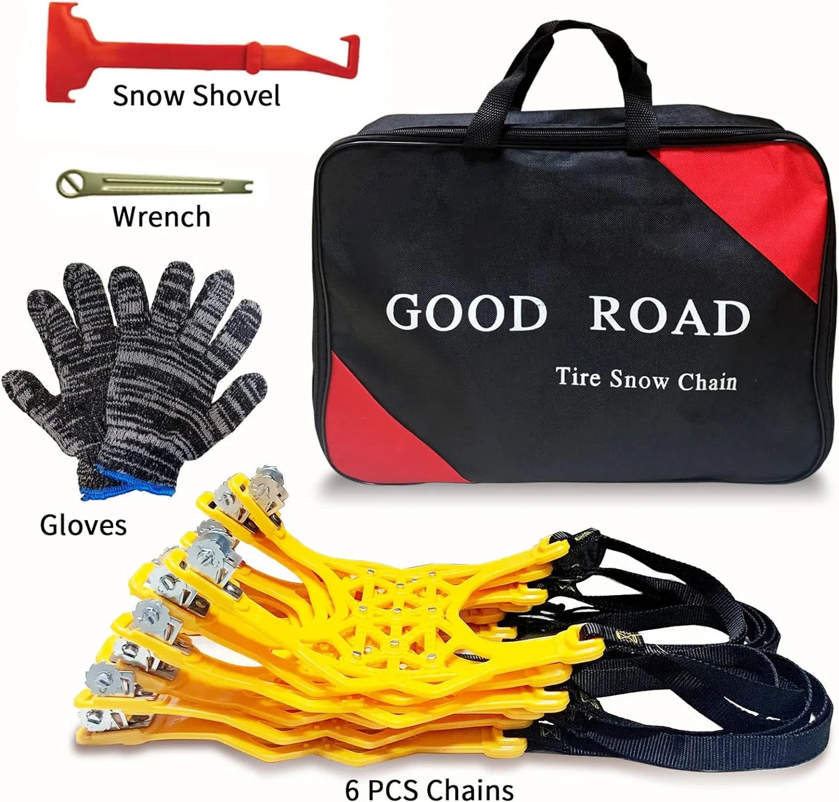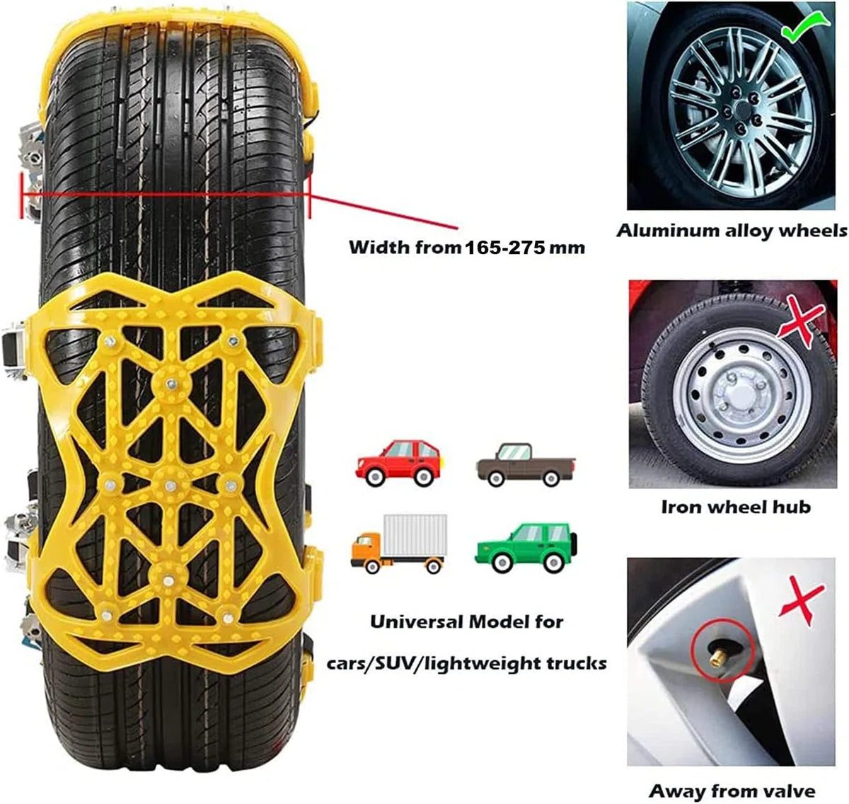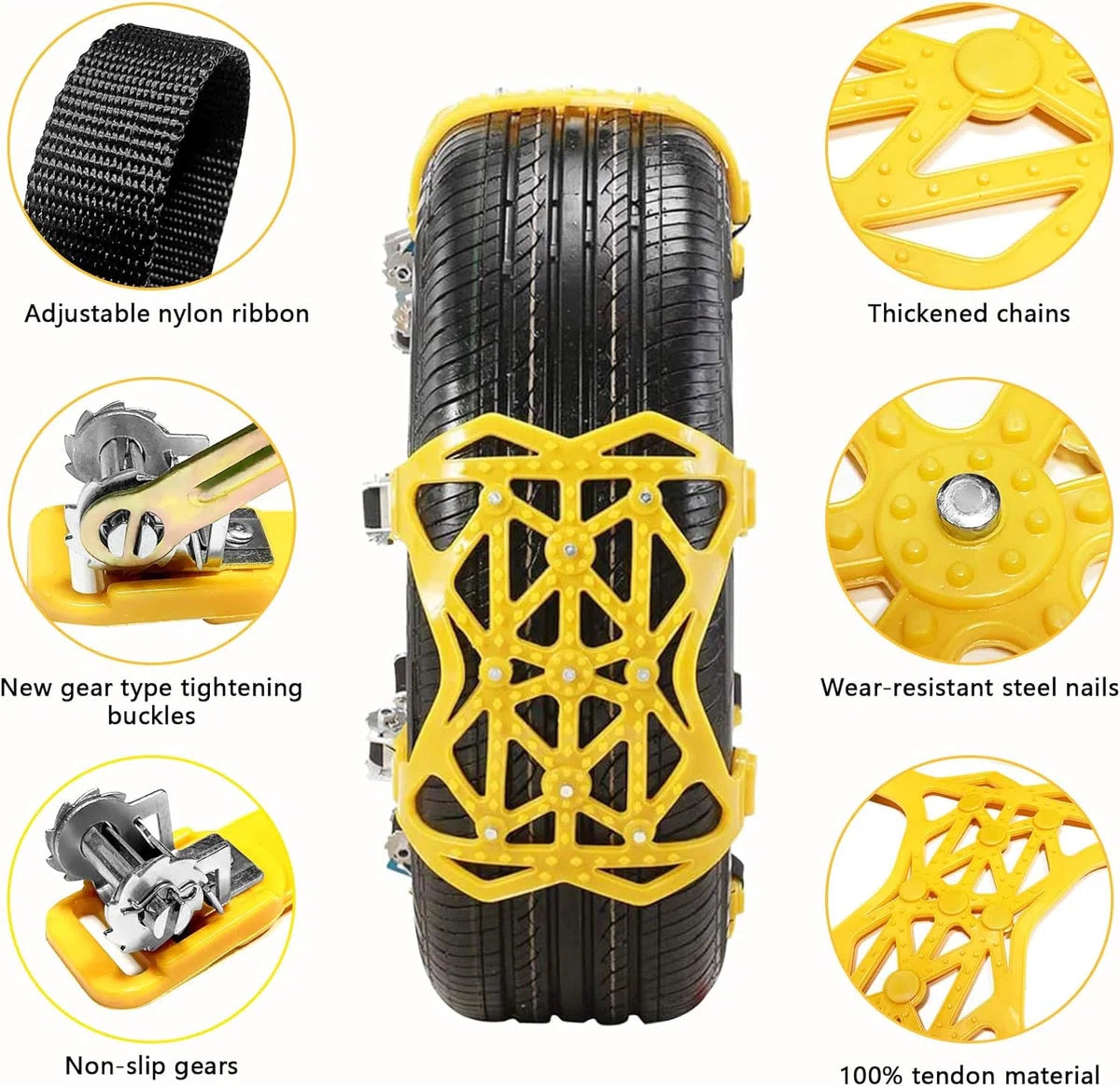 Premium materiaal: antislip sneeuwkettingen van puur premium staal, verdikt TPU, stalen bouten en bevestigingsmiddelen van aluminiumlegering en 100% pure dichotomanthes. Slijtvastheid, lage temperatuurbestendigheid -50℃, goede waterdichtheid, sterk draagvermogen, uitstekende slagvastheid, duidelijk schokabsorptie-effect. Universeel model: autosneeuwkettingen worden geleverd met metalen spijkers met een hoge hardheid, verhogen de wrijving tussen de band en de grond, zorgen ervoor dat de band voldoende grip heeft en zorgen voor veilig rijden op besneeuwde dagen. De sneeuwkettingen zijn geschikt voor de meeste voertuigen, normale auto's, SUV's, lichte vrachtwagens en kleine bestelwagens. Deze kan worden gebruikt voor alle standaard voertuigbanden met een bandbreedte van 165-285 mm, maar niet voor ijzeren wielnaven. Eenvoudig te installeren: de nieuwe spangespen van het tandwieltype maken de antislipkettingen niet automatisch los of verlaten de juiste vaste positie, en met verstelbare spanbanden is de installatie snel en eenvoudig. Het is niet nodig om het voertuig te verplaatsen of de banden te demonteren. Let op: De voertuigsnelheid mag niet hoger zijn dan 40 km/u. Pakketlijst: de set antislipkettingen bevat 6 x autosneeuwkettingen, 1 x draagbare opbergtas, 1 x sneeuwschep, 1 x sleutel, 1 x paar handschoenen. Meestal hebben voertuigen met voor- of achterwielaandrijving slechts één set nodig. Als het een 4x4 is, koop dan 2 sets of meer die u nodig heeft. Brede compatibiliteit: sneeuwkettingen kunnen niet alleen een rol spelen in de winter en sneeuw, maar kunnen ook worden gebruikt voor langlaufen, veldonderzoek, skiën en bergbeklimmen. Er worden speciale sneeuwkettingen voor ruw oppervlak gebruikt om de wrijving te vergroten en de weg te wijzen om te voorkomen dat de banden gaan slippen, waarmee veilig kan worden gereden in slechte weersomstandigheden (zoals sneeuw, modder of ijs).