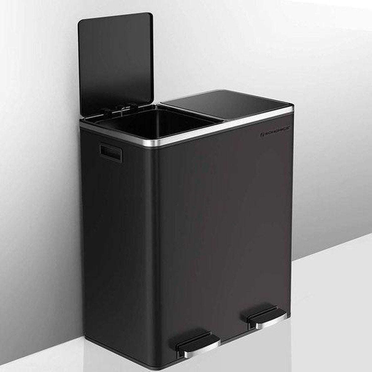 Songmics - Prullenbak - 60 Liter Inhoud (2x30) - Met 2 Gescheiden Bakken - RVS - Zwart