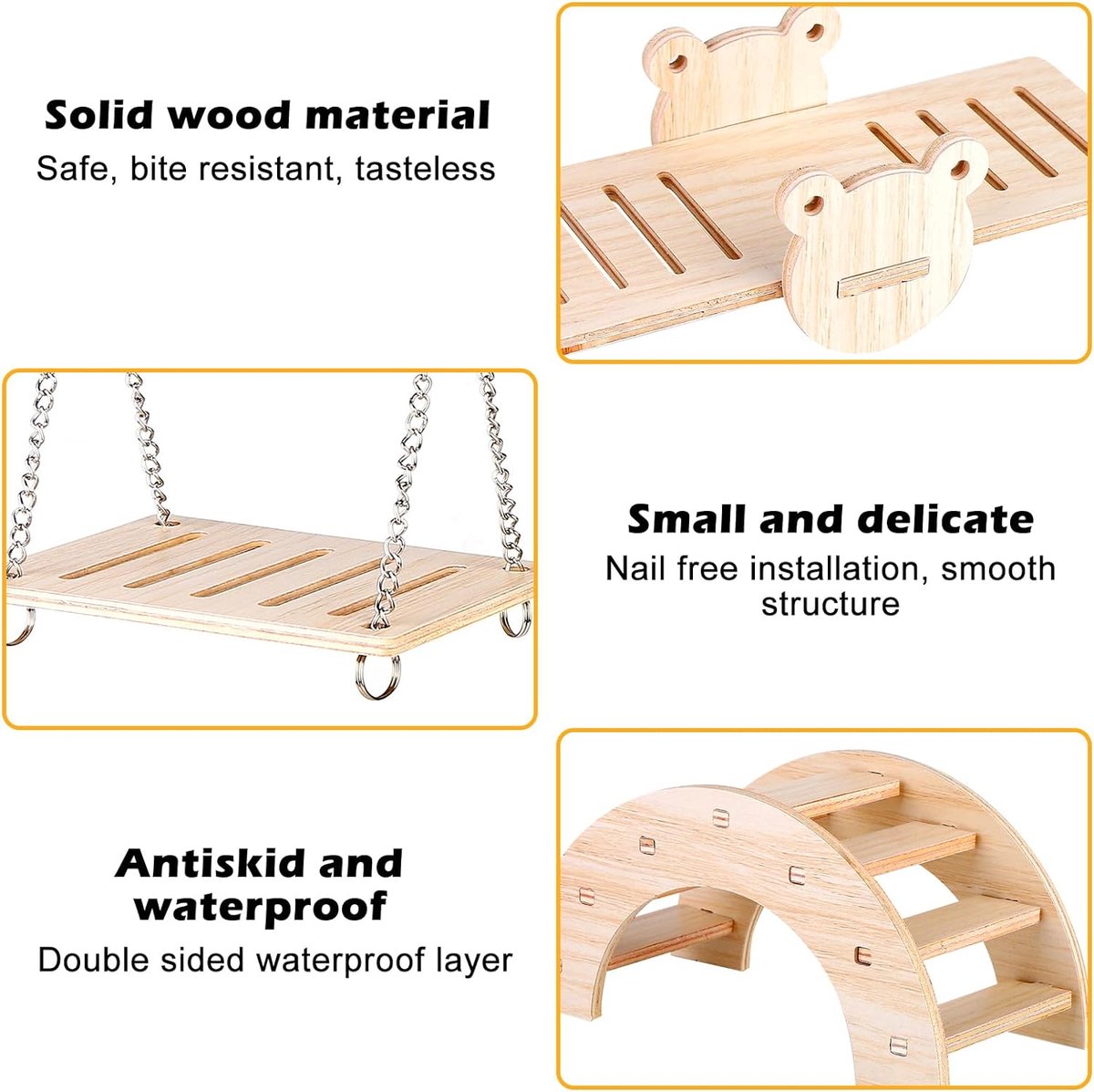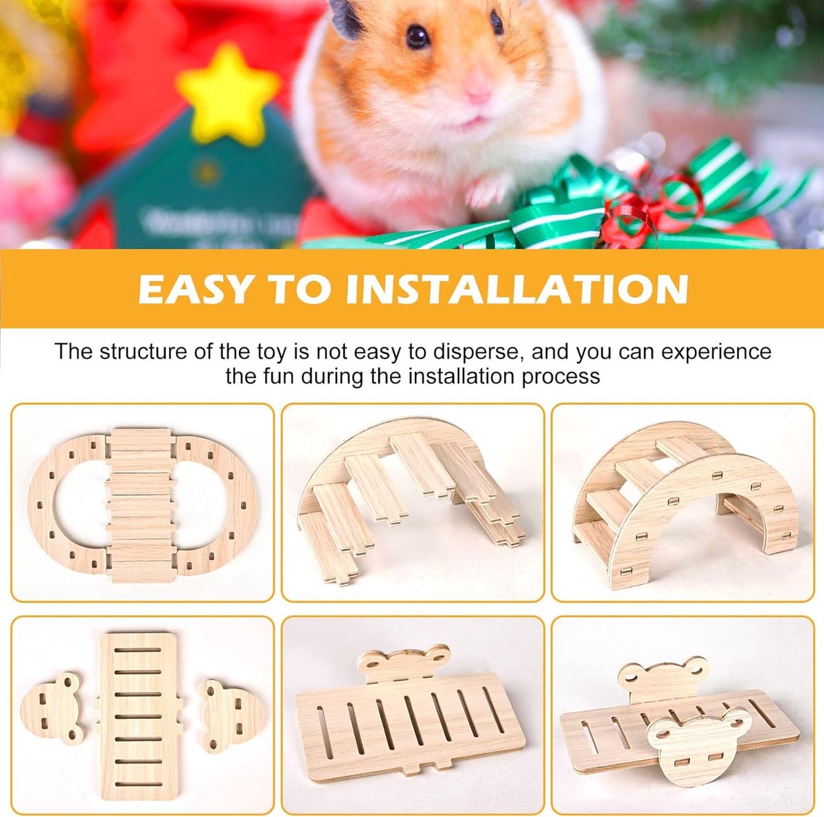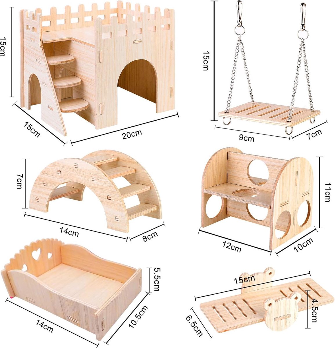 Speelgoed voor hamsters van hout, 6 stuks doe-het-zelf hamsterspeelgoed, hamsters, verstopplaats, huis, brug, wip, schommel, trainingsspeelgoed, hamsteraccessoires voor de kooi voor gerbils