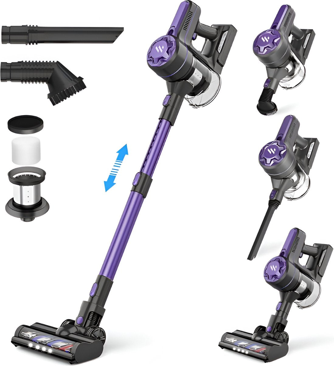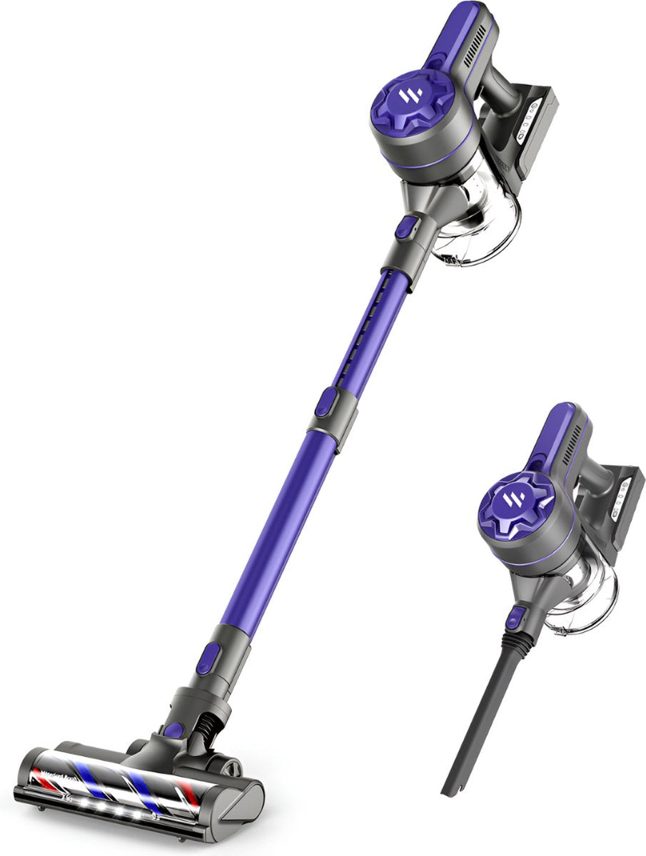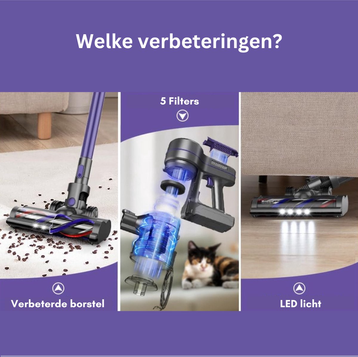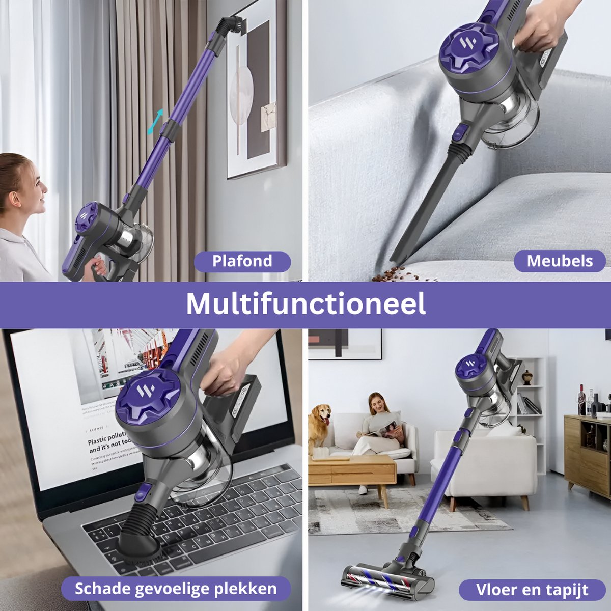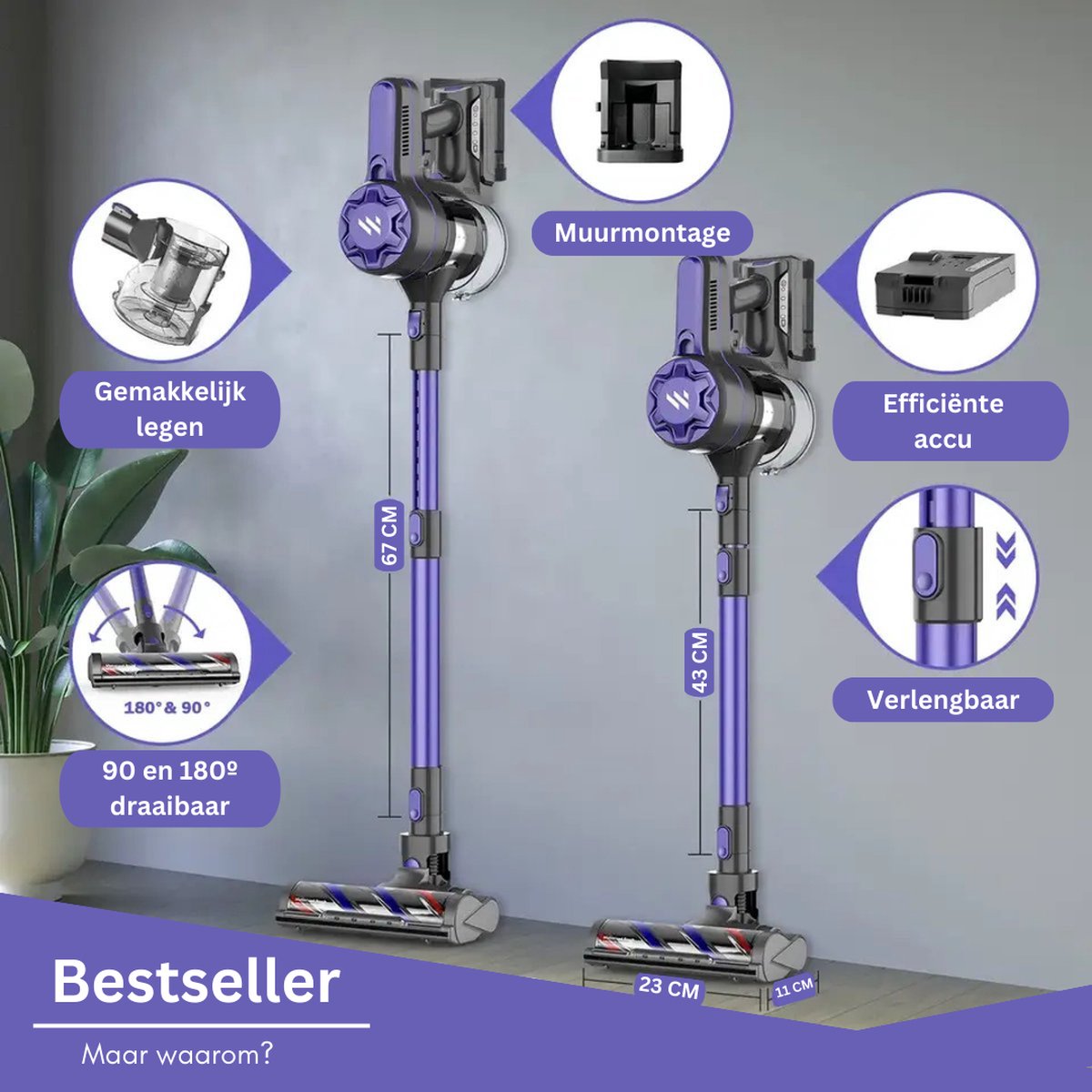Ben je op zoek naar een krachtige draadloze steelstofzuiger en kruimelzuiger in één? Dan is dit de stofzuiger voor jou! Met zijn slimme design heeft hij talloze pluspunten, bijvoorbeeld LED zuigverlichting, hij is gemaakt voor elke ondergrond, kan als kruimelzuiger gebruikt worden, heeft verschillende opzetstukken en nog veel meer.