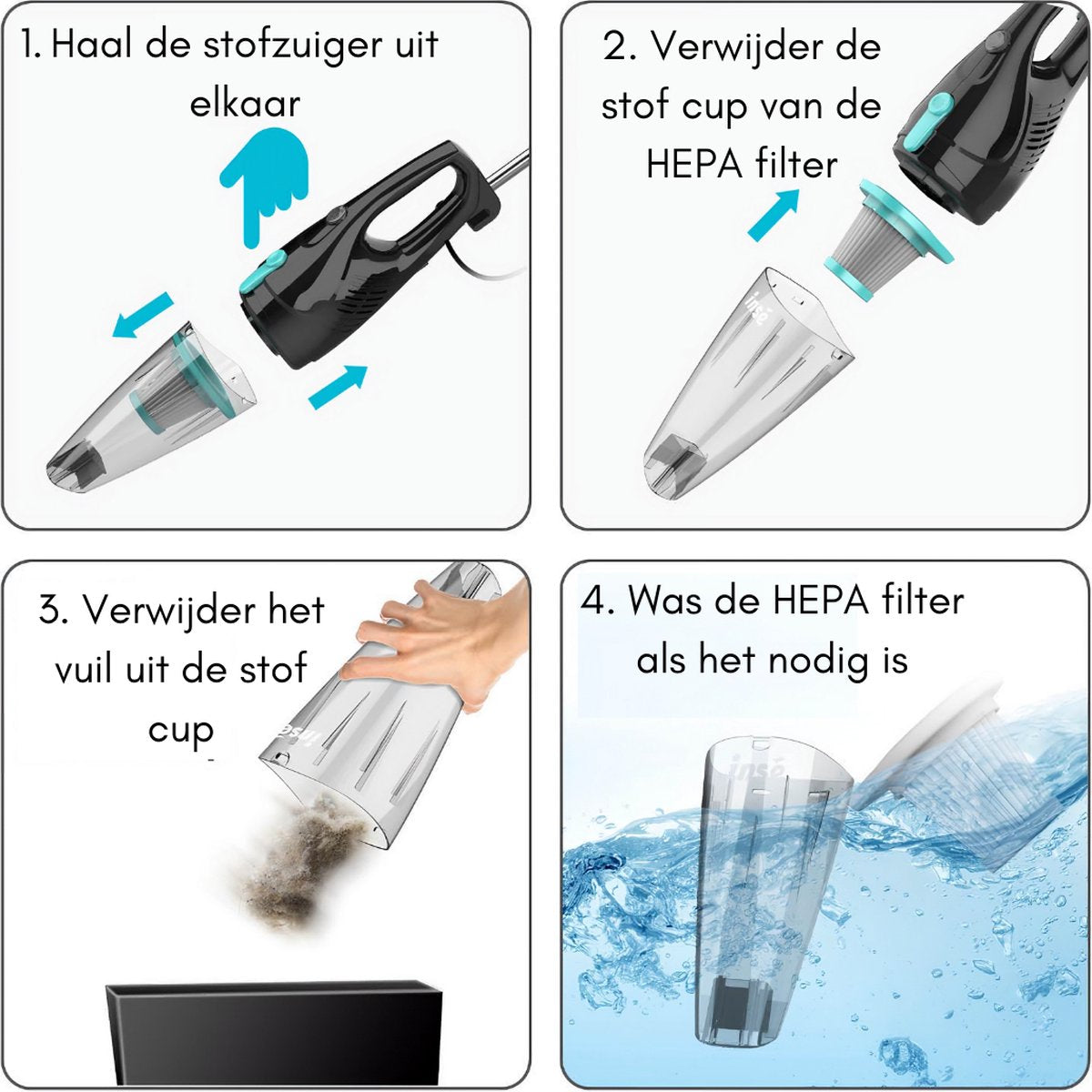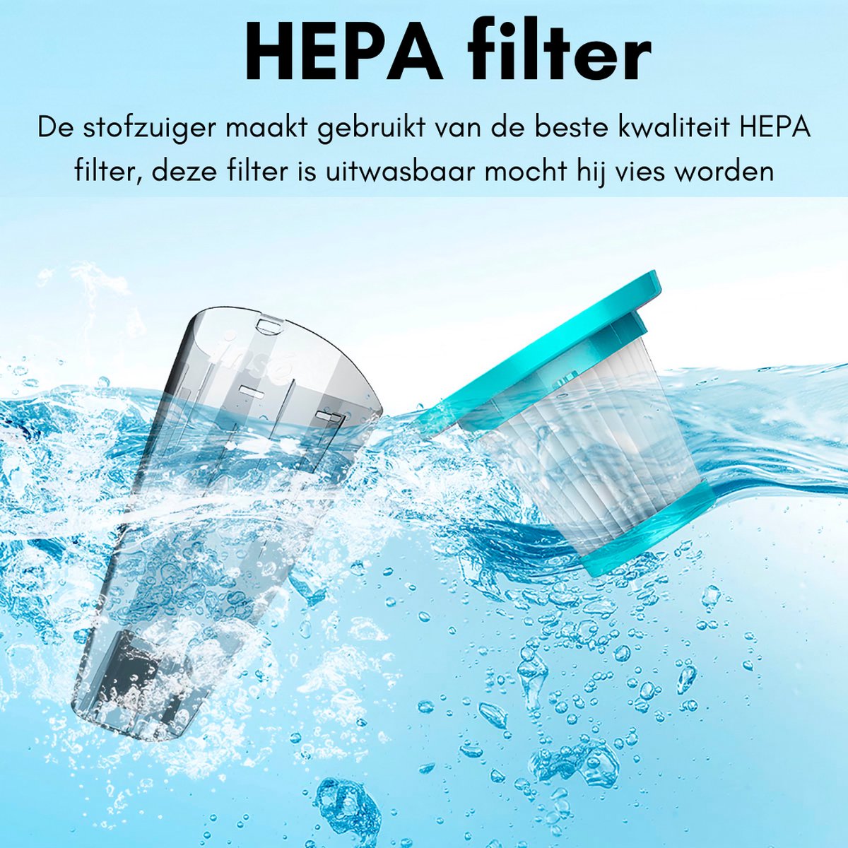 De stofzuiger heeft drie filters, eerst de filter voor grof vuil om de grote vuile stukken eruit te filteren. Daarna komt de speciale HEPA filter om de laatste stukken vuil eruit te filteren. Als laatste heeft de steelstofzuiger een spons filter zodat een eventueel natte vloer geen schade aan de stofzuiger maakt. In jouw bestelling zit een extra HEPA filter meegeleverd, zo heb je er altijd één over!