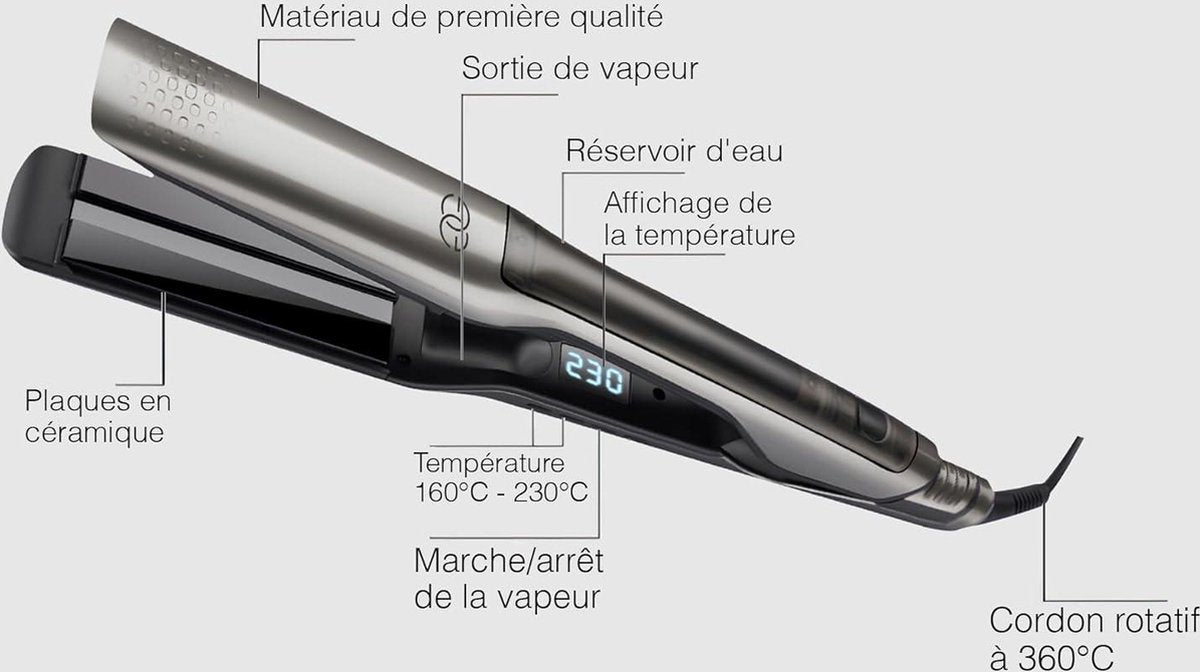 - Stoomfunctie maakt het haar sneller steil en laat verzorgingsproducten beter intrekken