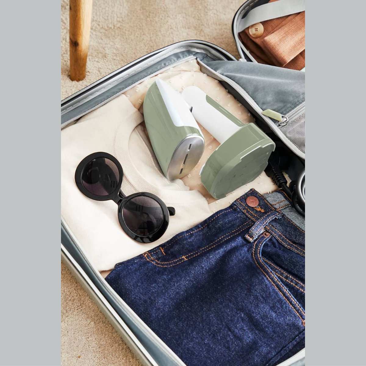Een ultracompacte kledingstomer met een exclusieve opvouwbare kop voor gemakkelijk dragen