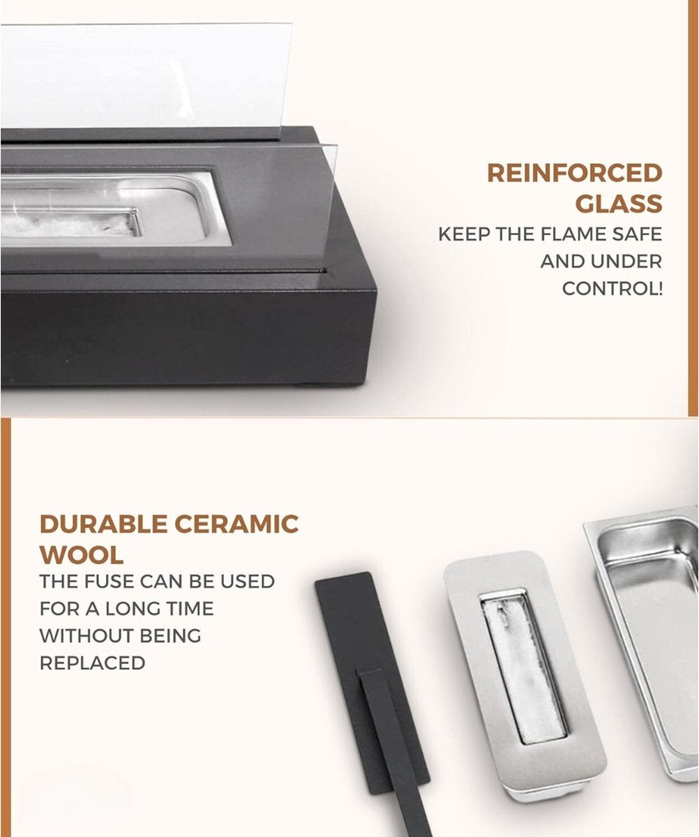 Deze sfeerhaard combineert een strak design met een metalen basis, RVS brander en glazen afwerking. Dit geeft het een elegante en uitnodigende uitstraling. Het eenvoudige montageproces, waarbij u alleen de glasplaten hoeft te plaatsen, maakt het gebruik van de sfeerhaard gemakkelijk en handig.