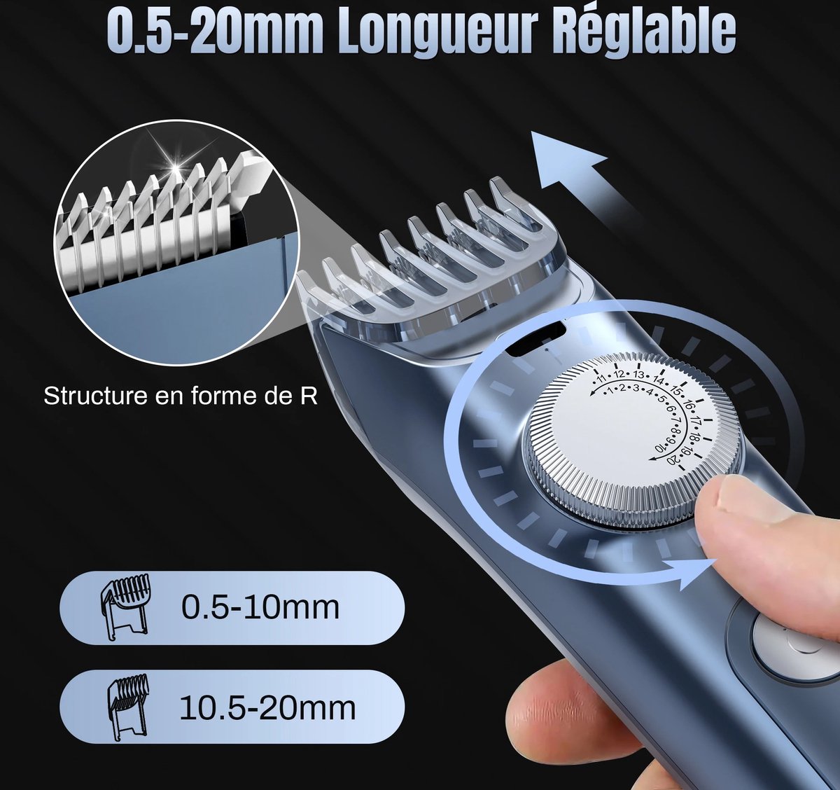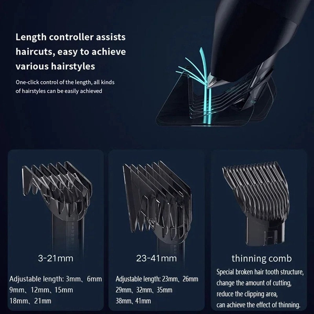 - Instelbare lengtes: Meerdere kammen voor verschillende lengtes (1 mm tot 25 mm)