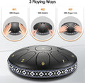 De tong trommel is gemaakt van licht en sterk koolstofstaal; gelakt in matzwart. Het heeft 13 verschillende noten. Er is geen muzikale kennis nodig om de tong trommel te kunnen bespelen. Of je nu met drumstokken of je handen speelt, de Tong Drum is moeiteloos te bespelen.