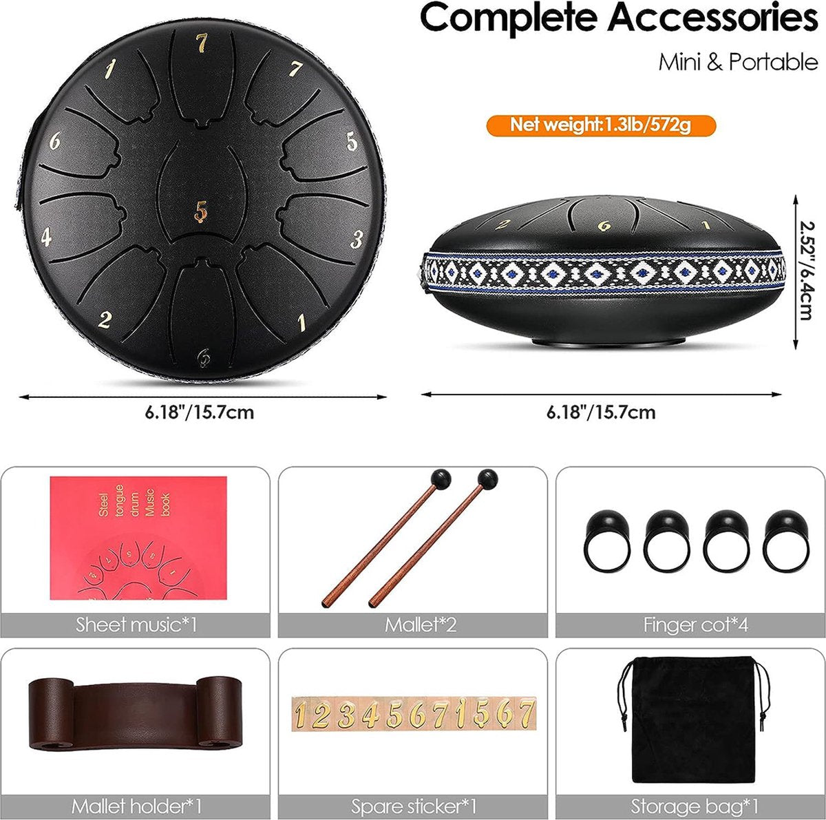 De Tong Drum wordt geleverd met een accessoirepakket dat drumstokken, een handige draagtas en zelfs een muziekboekje bevat. Hiermee heb je alles wat je nodig hebt om je artistieke reis direct te beginnen.