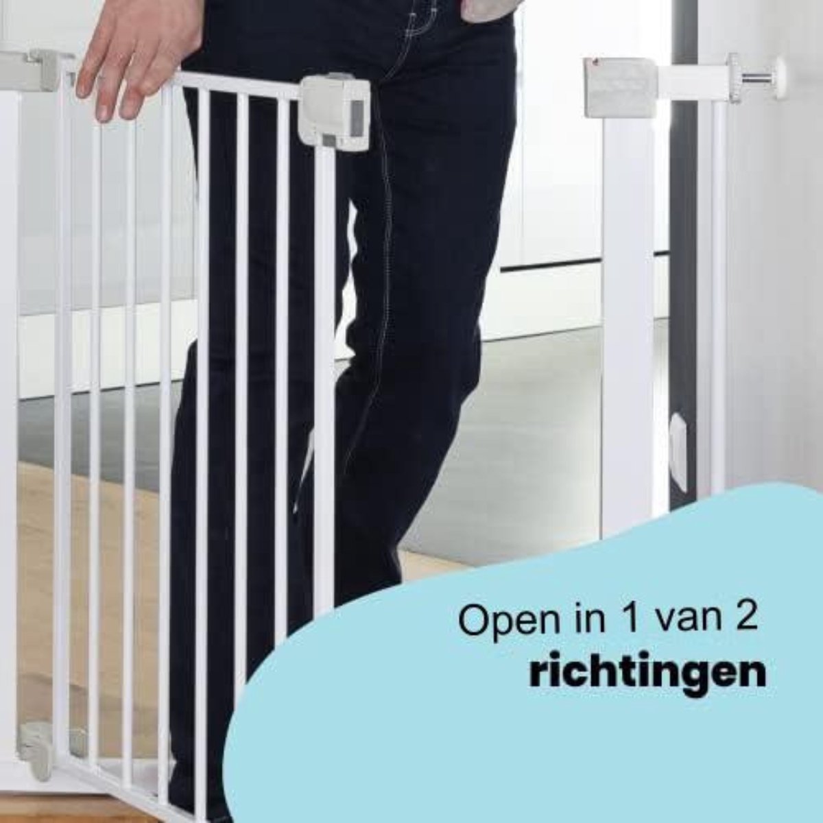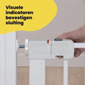 • Het brede traphekje heeft een extra brede doorgang en is met één hand te openen. Druk op de knoppen op de handgreep om het hek te openen en laat het weer sluiten om het automatisch te sluiten. De visuele indicator bevestigt of het traphekje goed gesloten is. Naast de ergonomische handgreep is het hek extra breed, zodat je er gemakkelijk doorheen kunt lopen. Open het hek in één of beide richtingen, afhankelijk van de locatie waar het babyhekje wordt geïnstalleerd. Voor de installatie is boren niet nodig, maar het heeft een eenvoudige klembevestiging voor een perfecte installatie.
