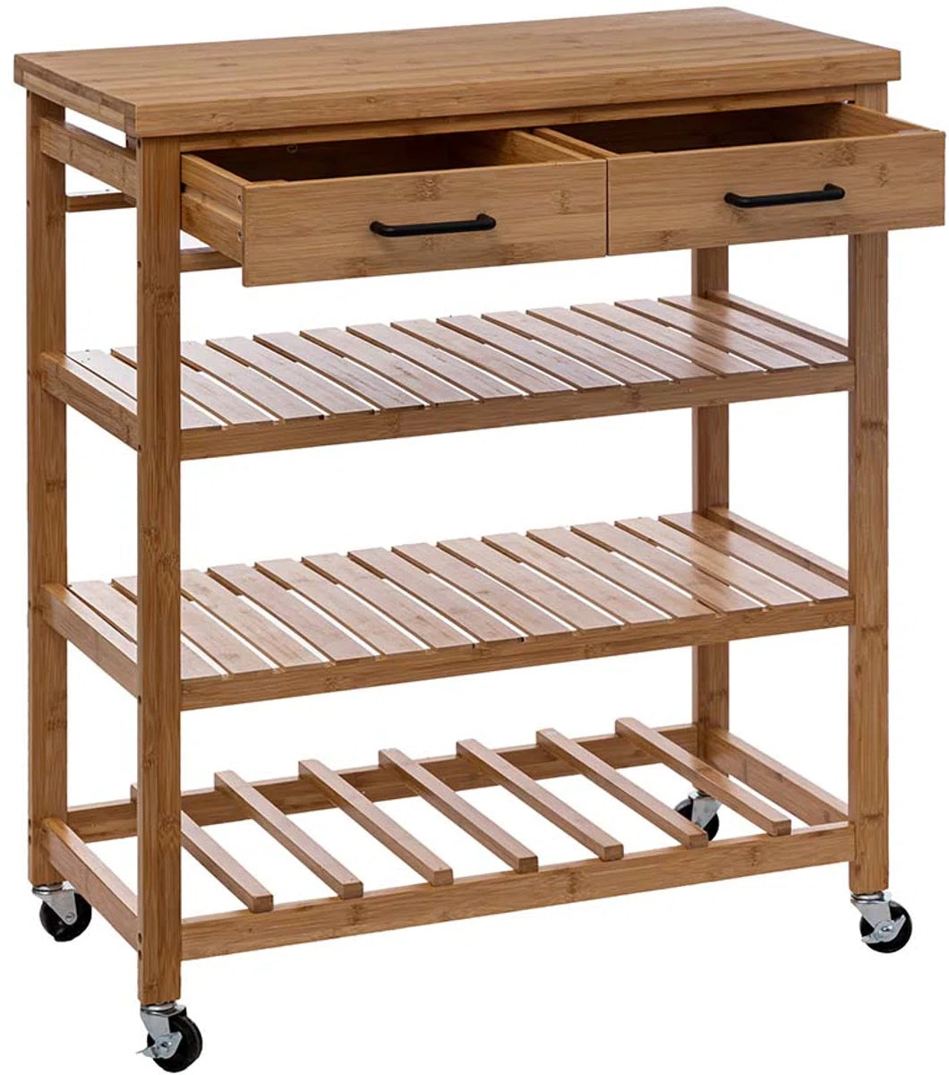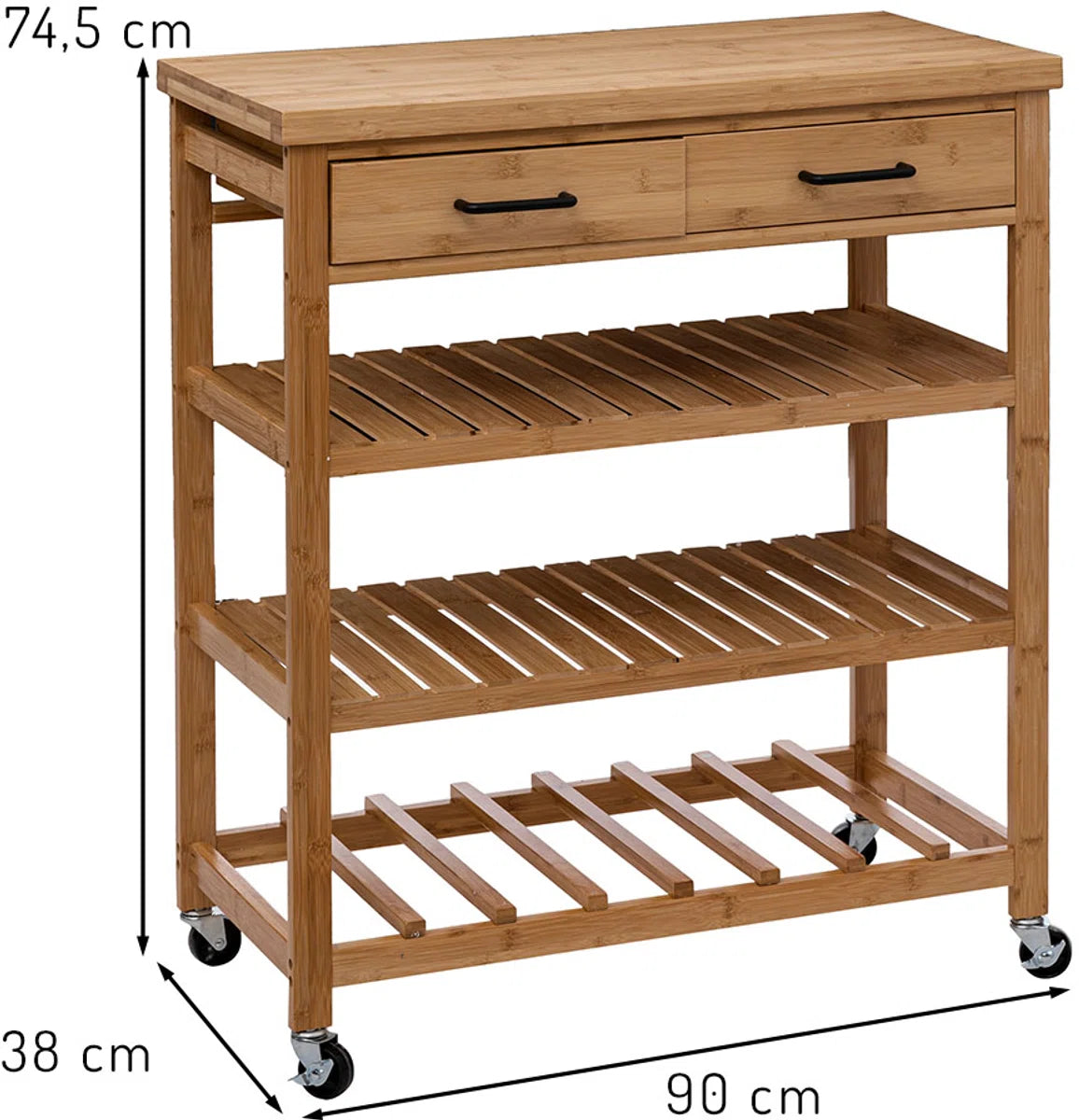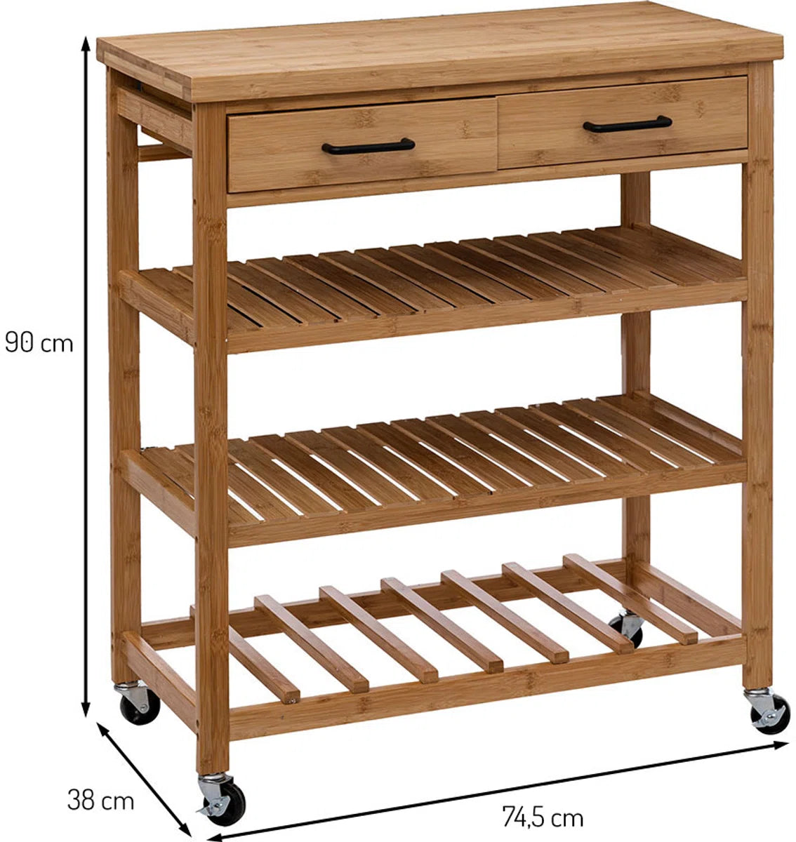 De Danae trolley is gemaakt van bamboe en is een handige toevoeging aan je keuken of badkamer. De trolley is uitgerust met 2 legplanken en 4 wielen. Afmetingen 74.5 x 38 x 90 cm