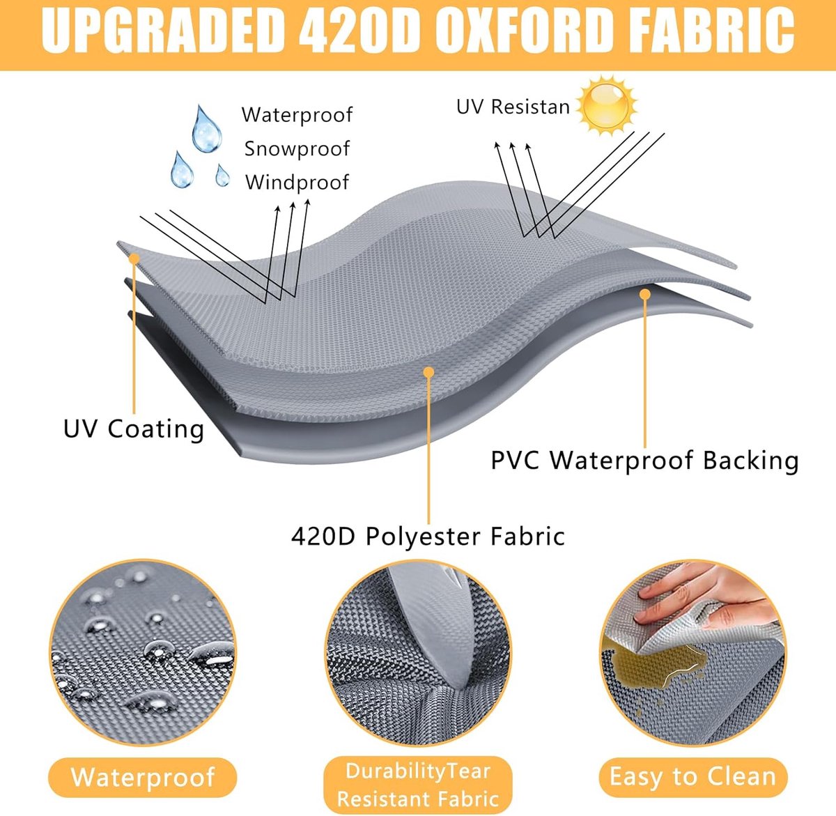 - 【Hoogwaardig waterdicht materiaal】: verbeterde versie van 420D Oxford-doek, de terrasmeubelhoes is bestand tegen 10.000 mm waterdruk. Met duurzame Oxford-doek vervaagt de dikke coating niet, is hij waterdicht, bestand tegen UV-stralen, sneeuw, scheurt, vervaagt en beschermt je meubels beter tegen ruwe omgevingen zoals fel licht, regen, sneeuw, stof, enz.