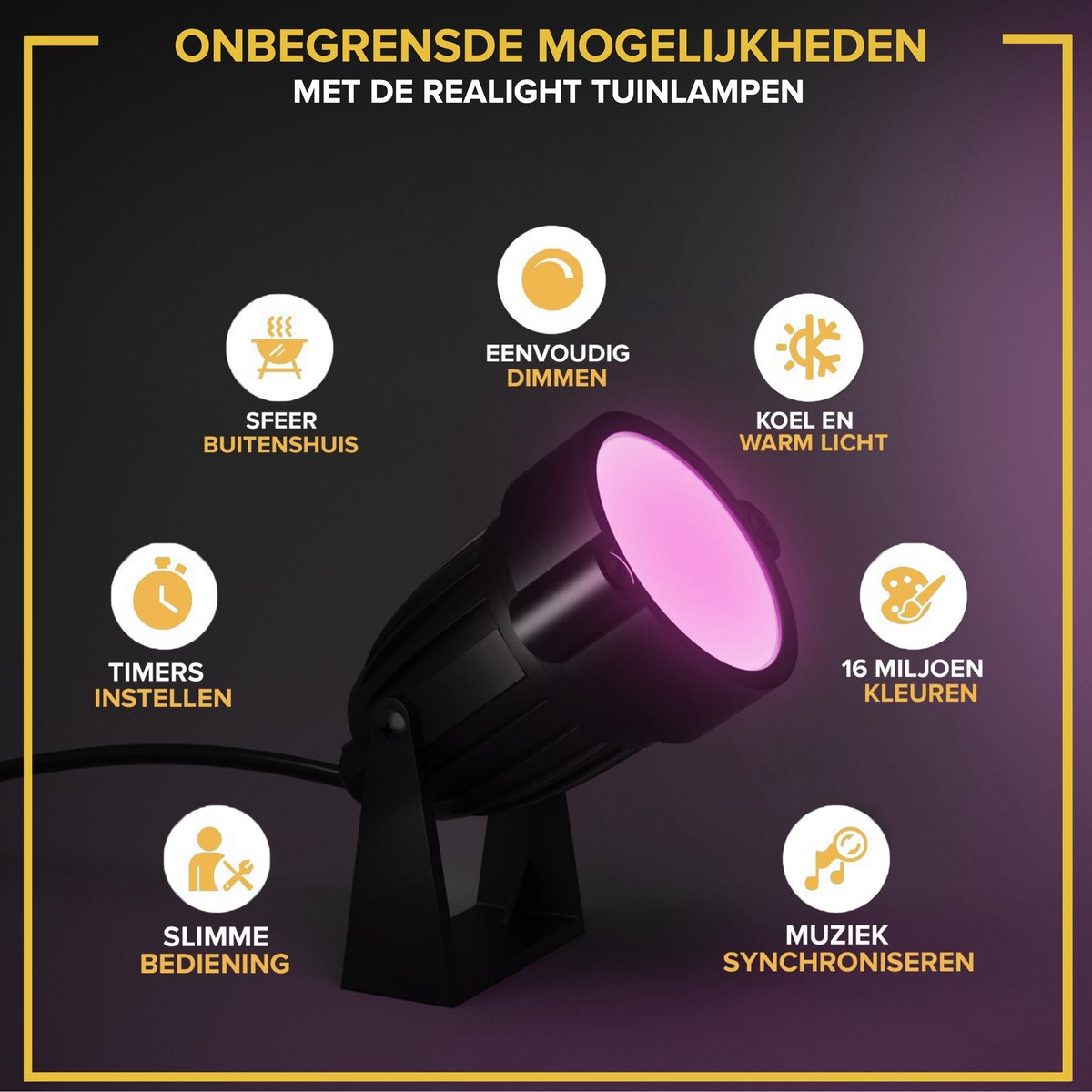Kies voor de ultieme sfeer in je tuin, met deze LED tuinverlichting van Realight®. Deze lampen mogen in geen enkele tuin ontbreken, ze zorgen voor sfeer en gezelligheid en zijn gemakkelijk te bedienen met onze app en afstandsbediening. Kies voor 1 van de 16 miljoen kleuren, voor koel of warm licht. Daarnaast kun je de kleuren ook instellen door middel van een timer en laten synchroniseren met je favoriete muziek!