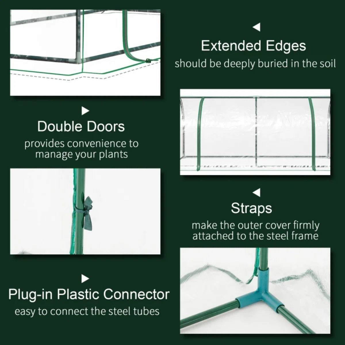 Tip: De folie is aan de zijkant 10 cm langer dan de metalen buizen, de onderkant kan in de grond worden ingegraven of verzwaard met stenen. Dit maakt de kas stabieler