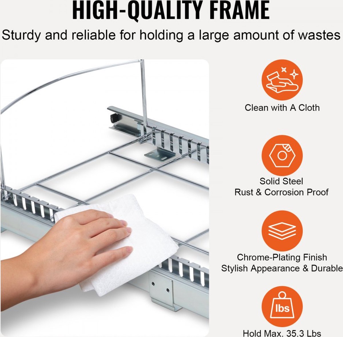 Ruimtebesparend ontwerp: in tegenstelling tot gewone vuilnisbakken die ruimte in de keuken kunnen innemen en in de weg kunnen staan, kan deze uittrekbare prullenbak in de kast worden ingebouwd om ruimte in de keuken te besparen. (vuilnisbak niet inbegrepen)DUURZAME CONSTRUCTIE: Het frame van deze onderbouwbak is gemaakt van ijzer, waardoor hij zeer goed bestand is tegen roest en corrosie en kan worden gereinigd met een doek. De oppervlaktebehandeling draagt bij aan de elegante uitstraling en duurzaamheid. De afvalbak kan maximaal 16 kg afval bevatten zonder dat dit ten koste gaat van de prestaties en kan moeiteloos in en uit worden geschoven via een volledig uitschuifbaar verlengstuk.Lichtlopende en stabiele wagen: deze uitschuifbare prullenbak onder de tafel beschikt over een hoogwaardig schuifsysteem. Je trekt de prullenbak zacht en stil in en uit, zonder obstakels en zonder voortdurend verstellen. Dit maakt het verwijderen van afval gemakkelijk en handig.Binnen enkele minuten gemonteerd: Met de meegeleverde montagegaten en een set montageschroeven kan de uittrekbare afvalbak eenvoudig aan de basis worden bevestigd. Het wordt aanbevolen dat de openingsbreedte ≥ 13,4 inch (340 mm), de kastdiepte ≥ 21,2 inch (540 mm) en de kasthoogte ≥ 17,7 inch (450 mm) is. Na het meten van de kastgrootte kan de container binnen enkele minuten worden gemonteerd. Bent u klaar om uw nieuwe container te laden?Verborgen ontwerp: een ideale oplossing om uw afvalbak uit het zicht en toch gemakkelijk toegankelijk te houden. Wanneer u uw afval wilt weggooien, trekt u de container eenvoudig uit de onderkast. Hierdoor kunnen kinderen of huisdieren hem niet per ongeluk omstoten en blijft je huis, kantine, bar etc. schoon.