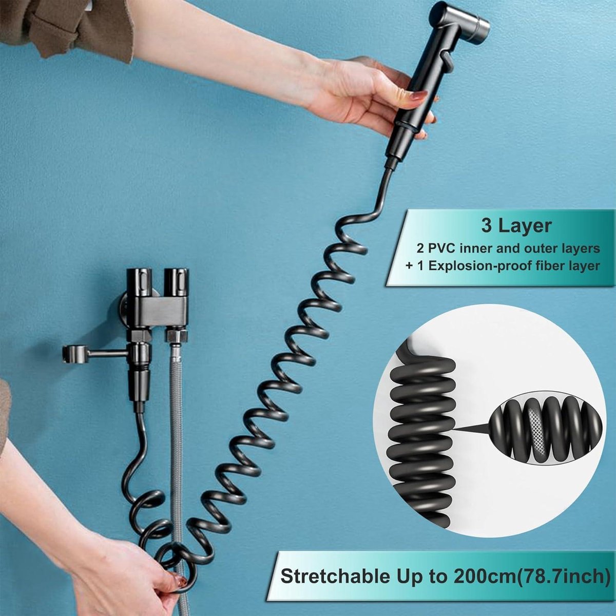 Met de lange uittrekbare slang van 2 meter biedt de bidet douche een groter bereik en meer bewegingsvrijheid zonder veel ruimte in beslag te nemen. Naast persoonlijke hygiëne kan het bidet ook worden gebruikt voor het wassen van planten, huisdieren, fruit, en schoonmaken van diverse oppervlakken in huis.