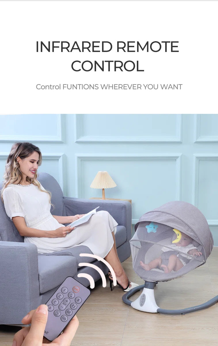 De bediening is een fluitje van een cent dankzij het handige LCD-touchpaneel, maar als je liever ontspannen wilt blijven, bieden we ook een handige afstandsbediening. Bedien de wipstoel vanaf de bank terwijl je kleintje liefdevol wordt gewiegd en tot rust komt.