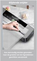 Met de snijfunctie van de vacuümmachine snijd je een vacuümzak of vacumeerfolie binnen enkele seconden netjes op maat. Halveer je een zak? Dan kun je de overgebleven helft eenvoudig opnieuw gebruiken dankzij het sealsysteem. Door zakken op maat te snijden, kun je voedsel efficiënter en compacter opslaan, zonder onnodig ruimte te verspillen.